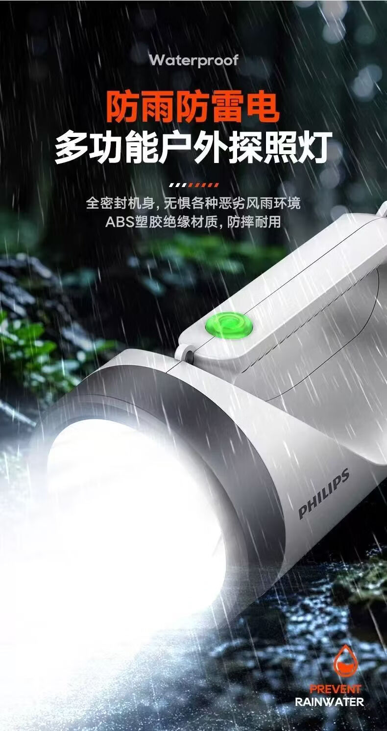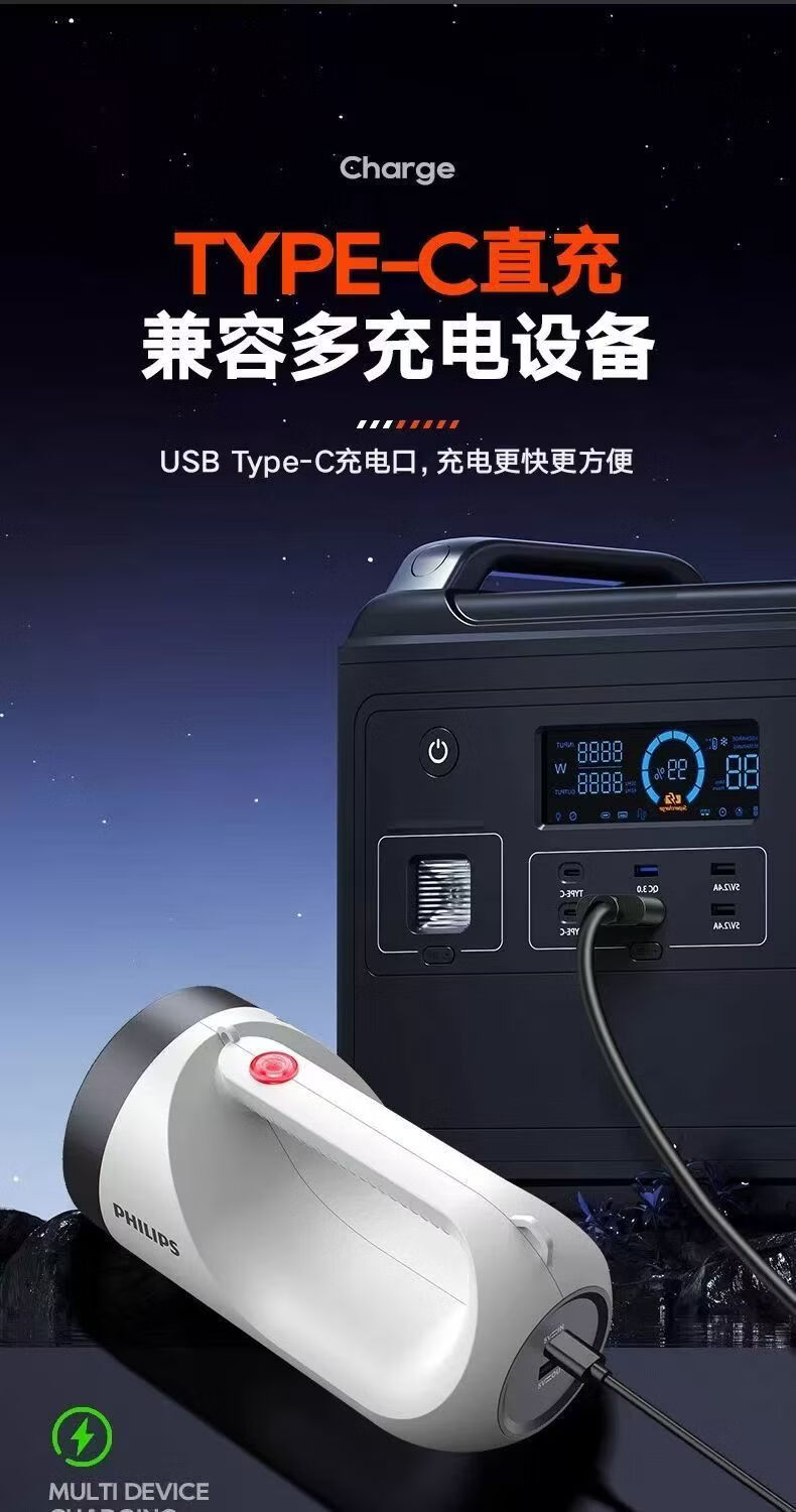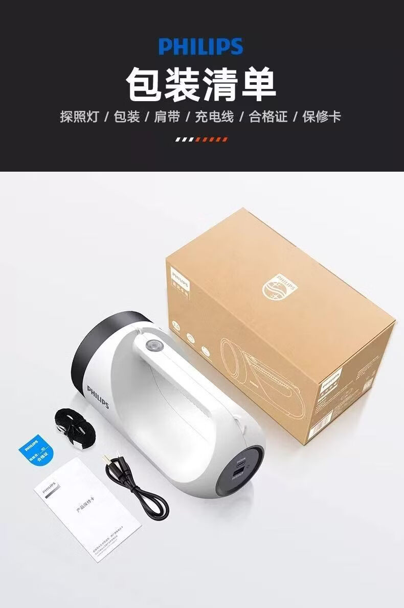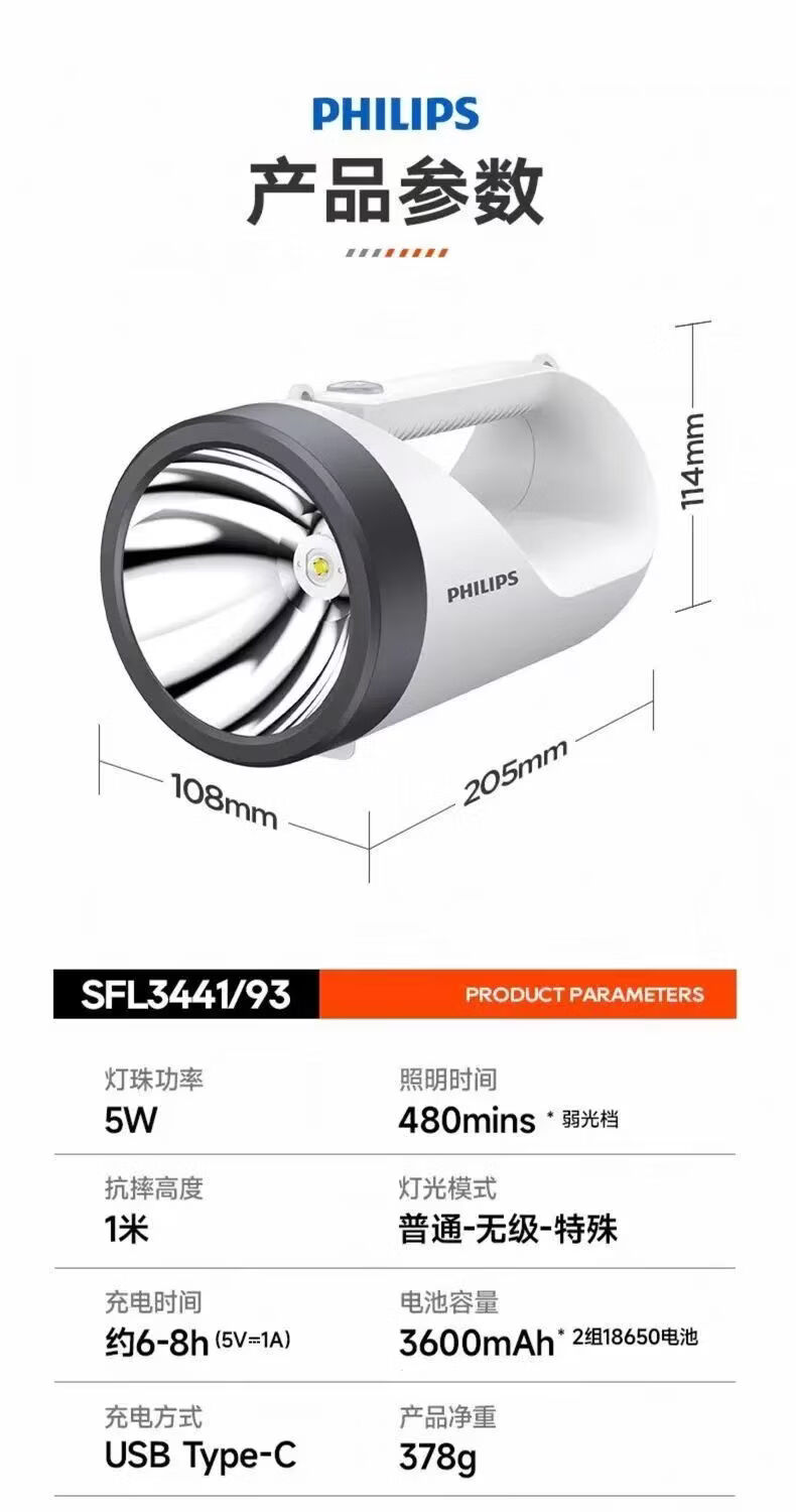 飞利浦(PHILIPS)手电筒强光广角远射超亮便携手提探照灯露营巡逻灯SFL3441W 5W/3600毫安/SFL3441W