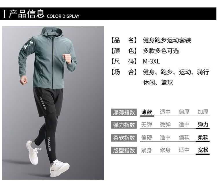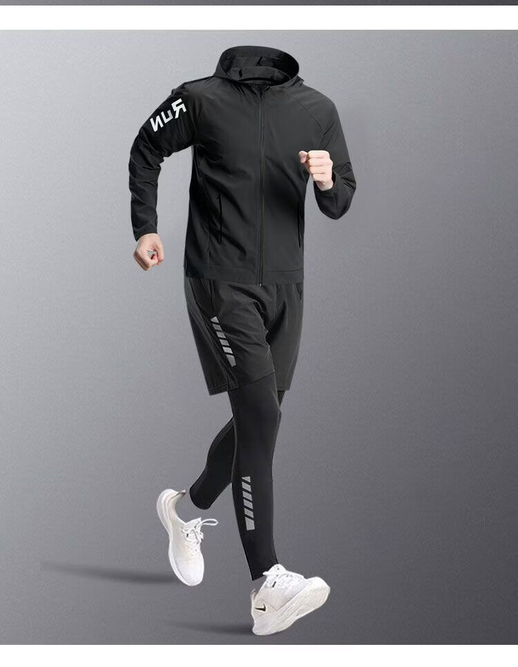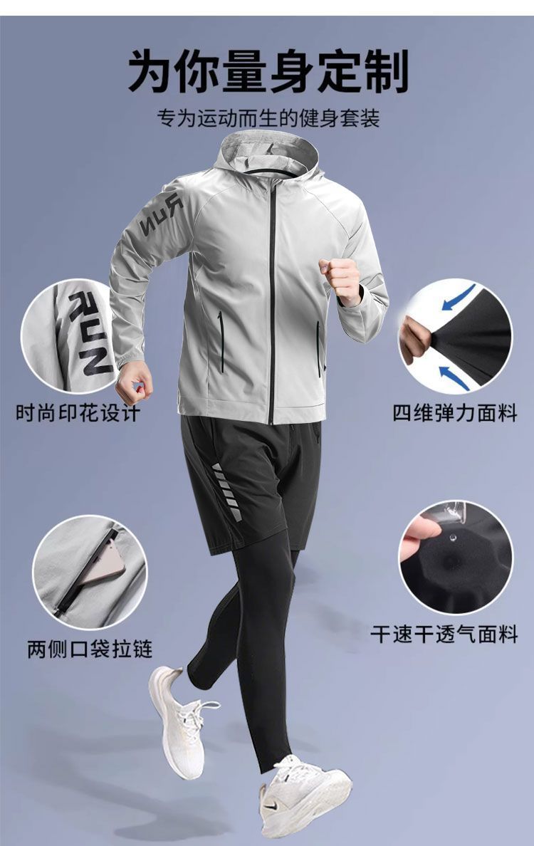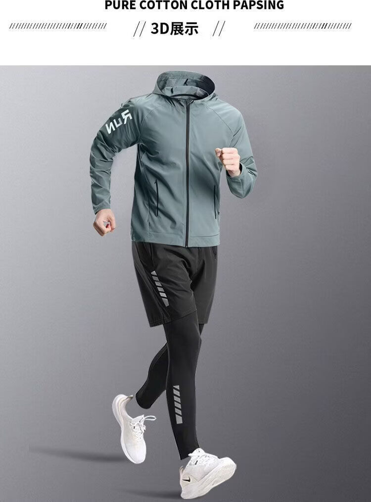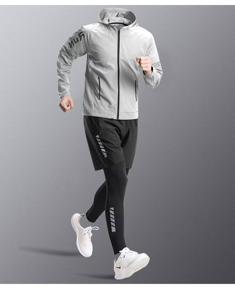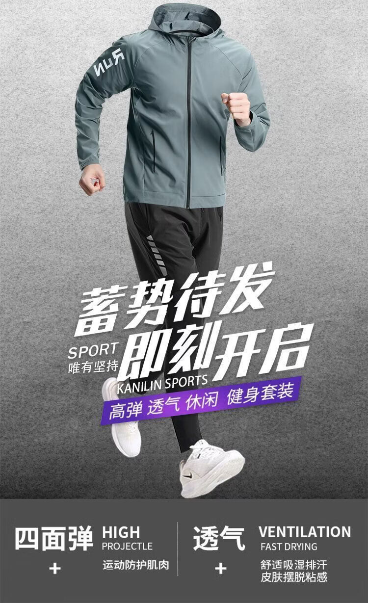 KLEONLOS 克仑洛斯新款跑步套装男士晨跑服速干马拉松运动套装训练服健身服男士套装 灰色四件套【速干 防风】 3XL 【建议170-190斤】