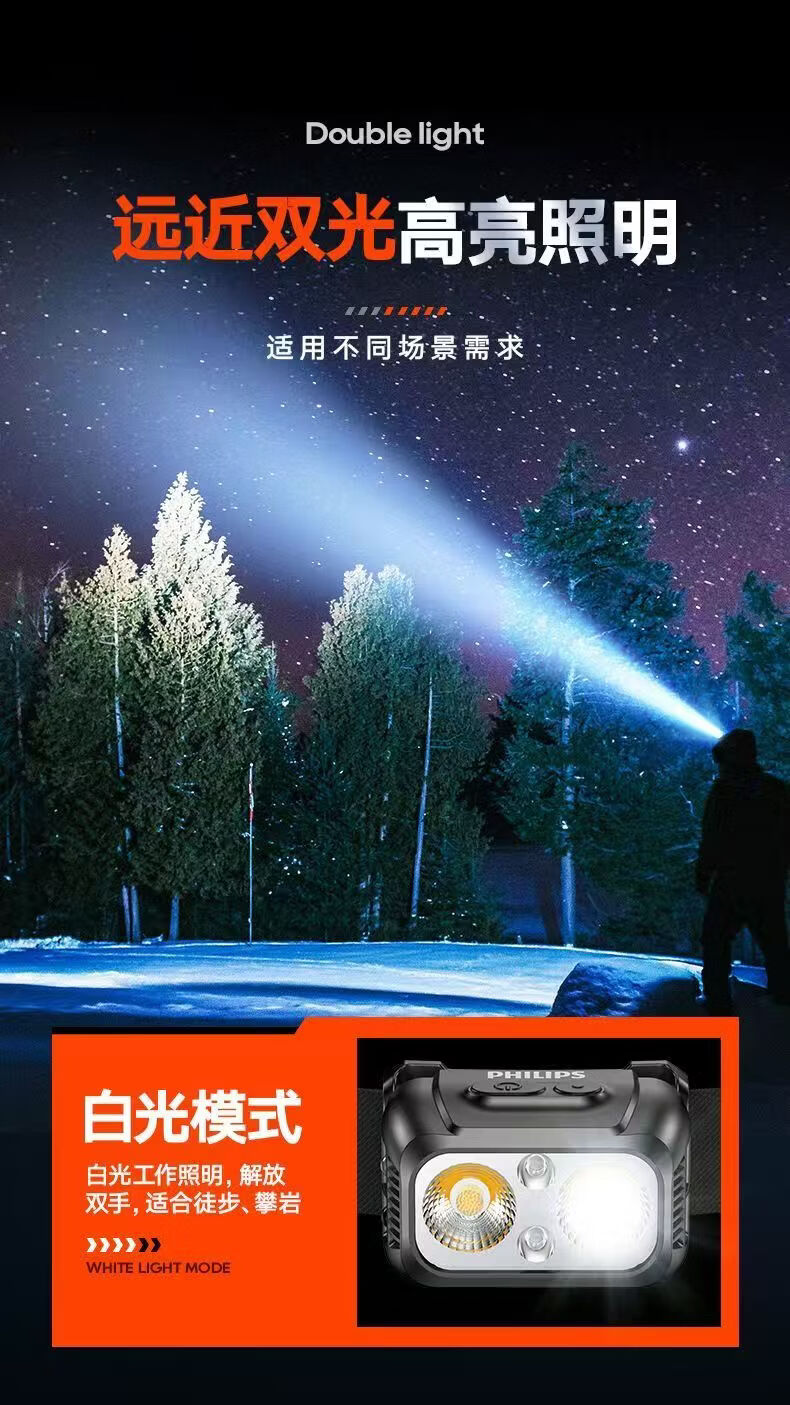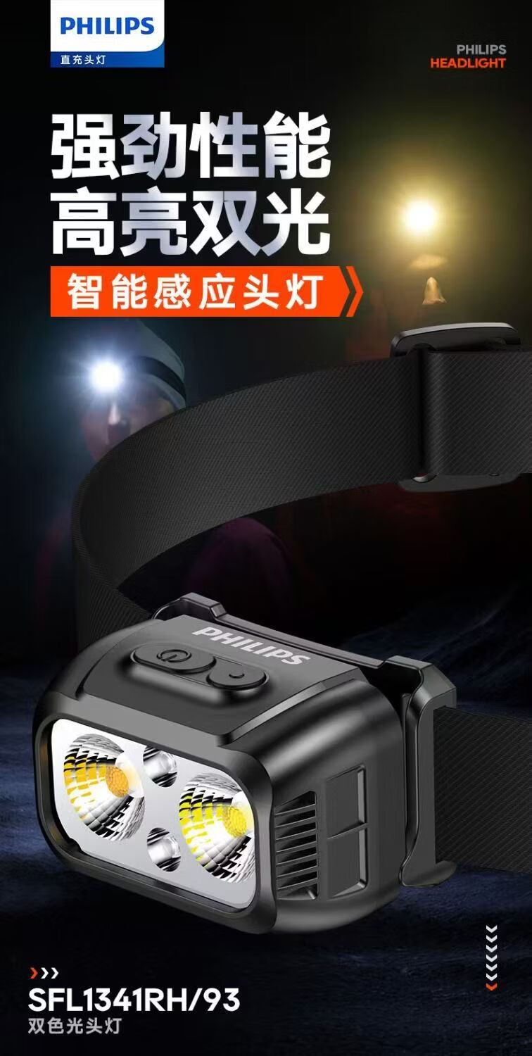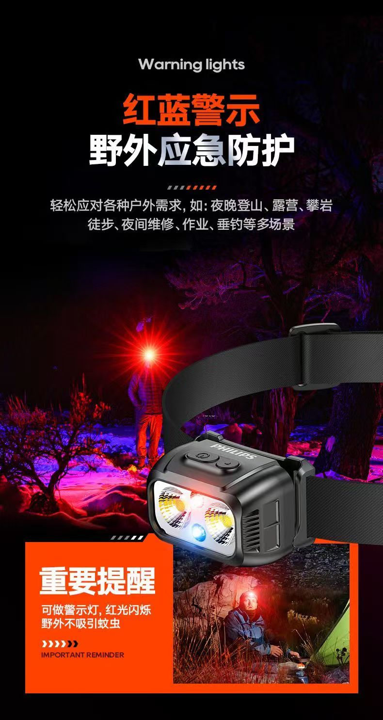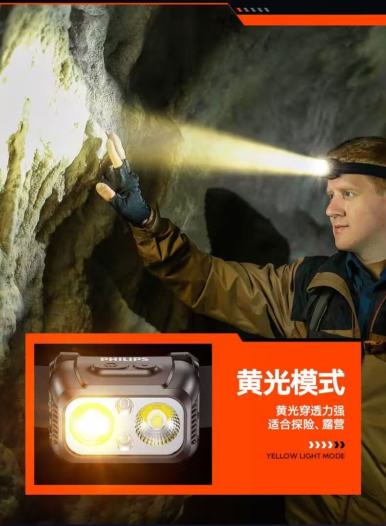 飞利浦(PHILIPS)感应头灯黄光白光双色夜钓强光充电高亮远射钓鱼头戴式照明SFL1341RH 5W/800毫安/SFL1341RH