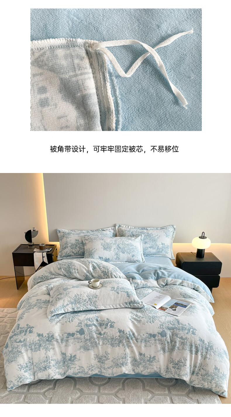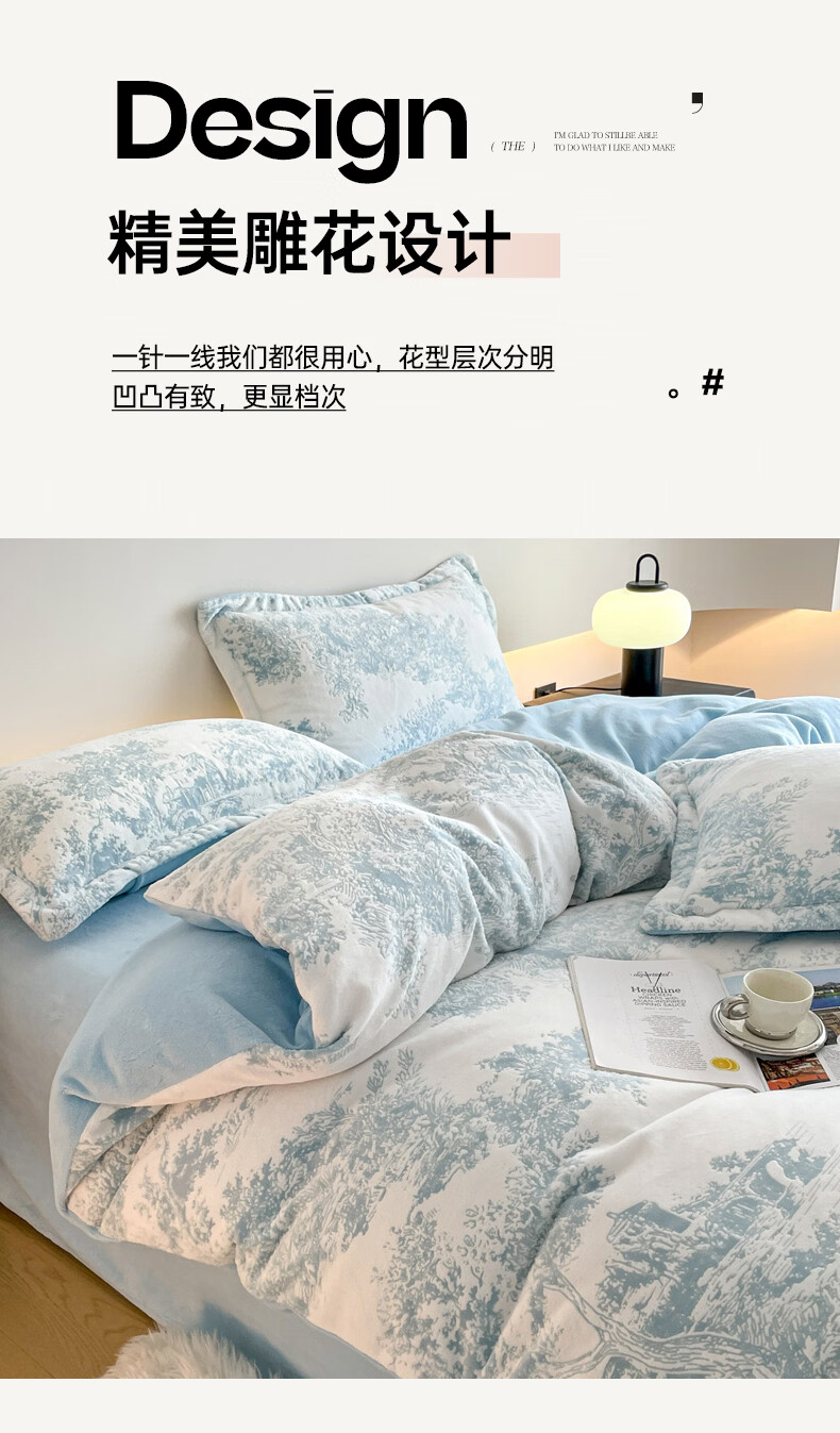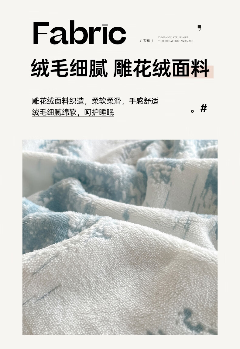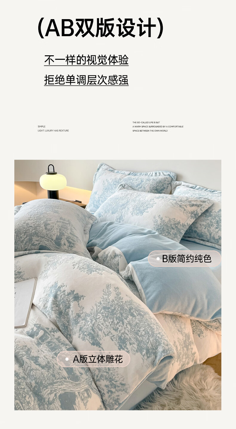 无印良品冬季雕花牛奶绒床上四件套双面加绒被套家用床单被罩保暖床笠套件 云木-蓝 【雕花牛奶绒 加厚保暖】 1.8m 床单款 四件套-被套200x230cm