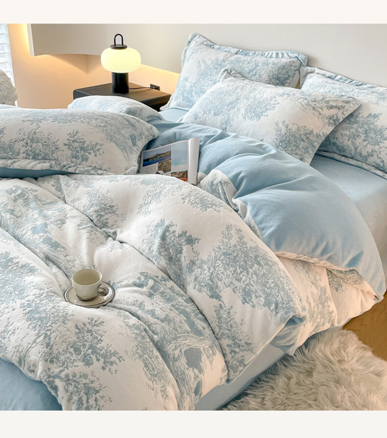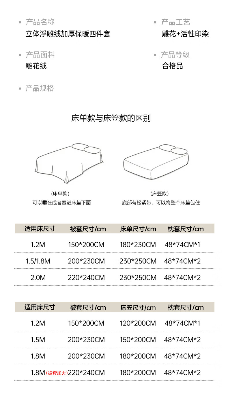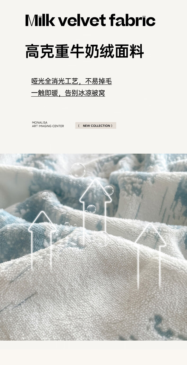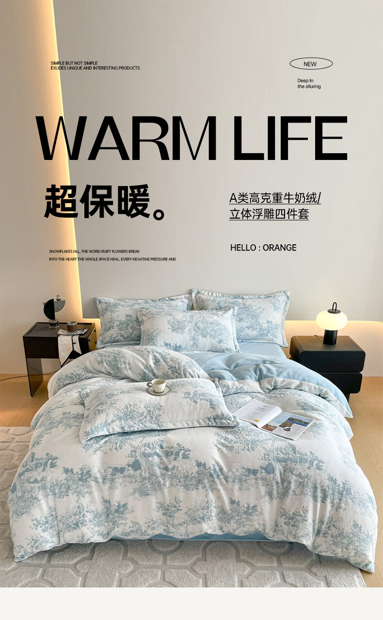 无印良品冬季雕花牛奶绒床上四件套双面加绒被套家用床单被罩保暖床笠套件 云木-蓝 【雕花牛奶绒 加厚保暖】 1.8m 床单款 四件套-被套200x230cm