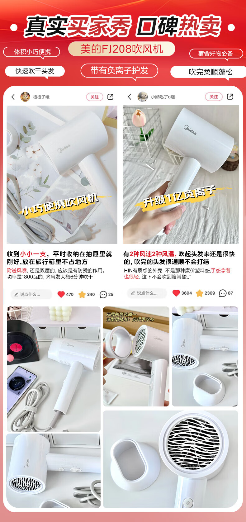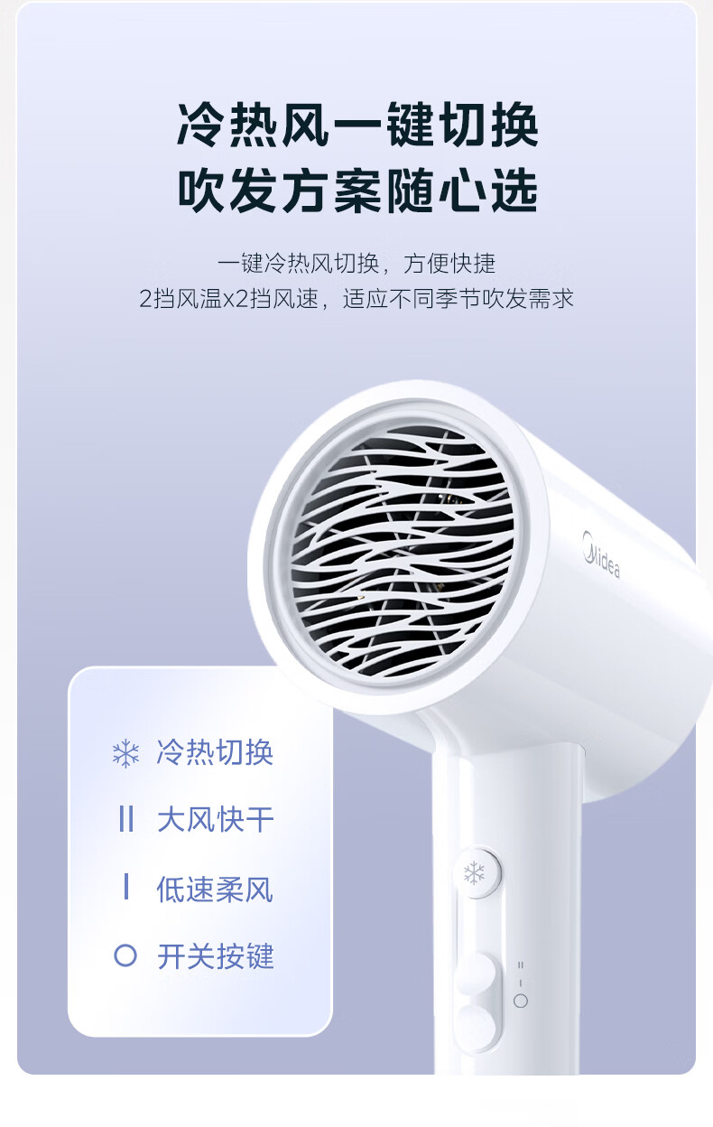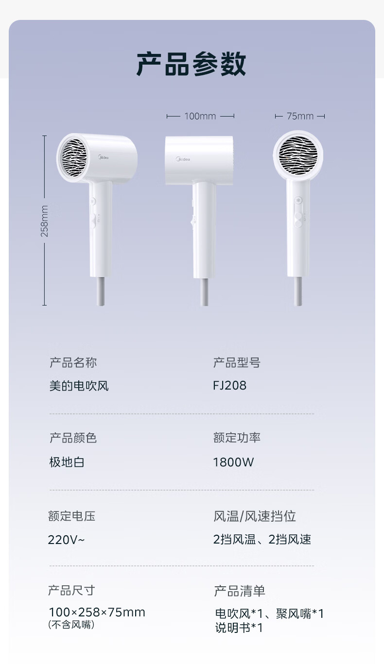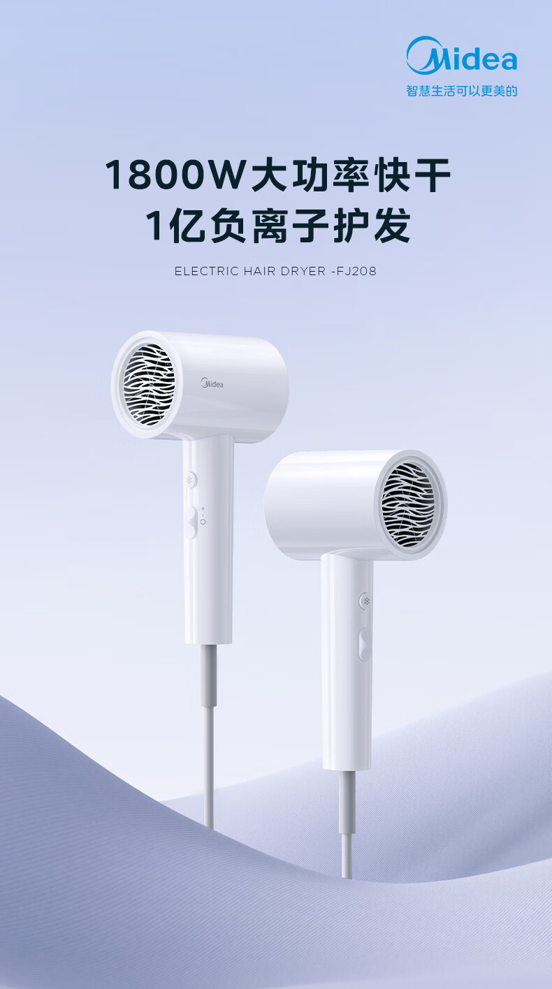 美的(Midea)1亿负离子电吹风 大功率快干不伤发吹风机 家用负离子护发吹风筒 FJ208白1800W 国家补贴 生日礼物