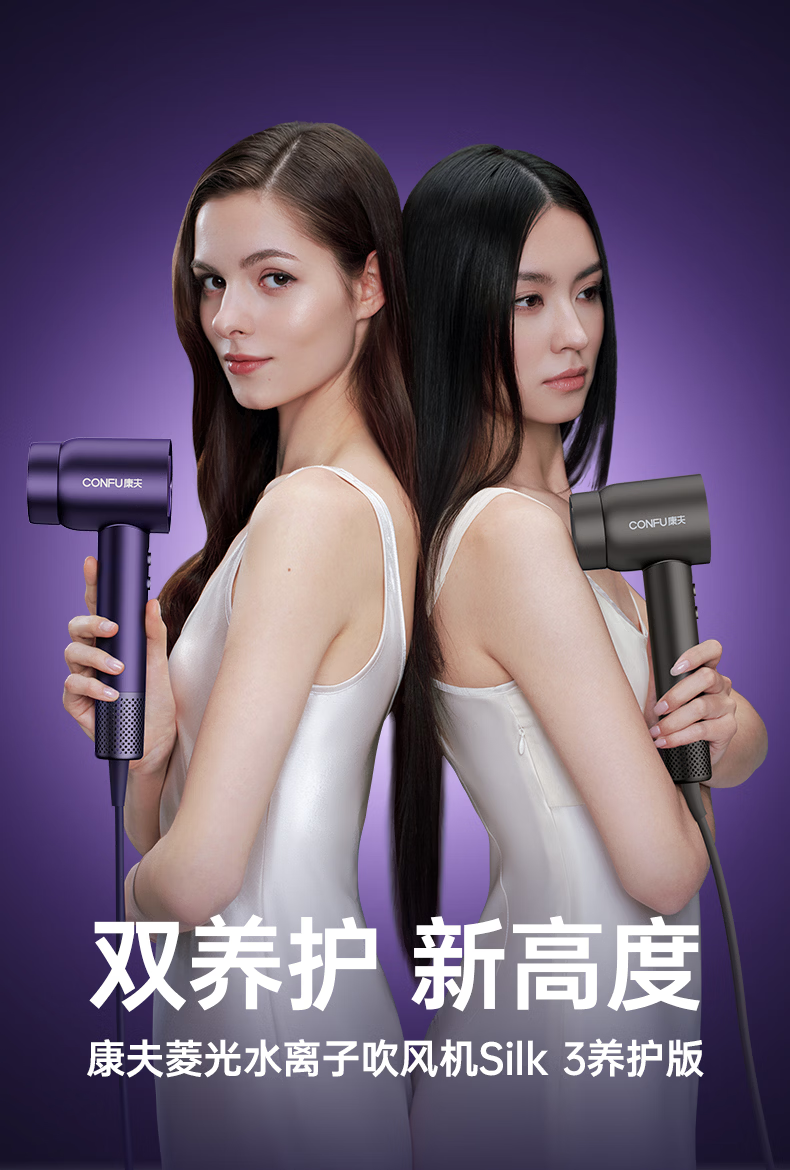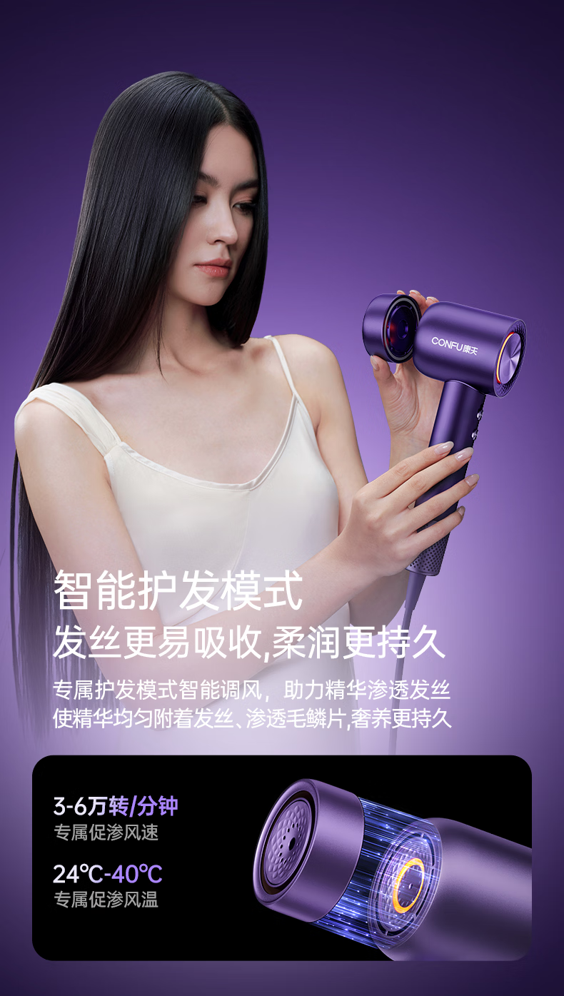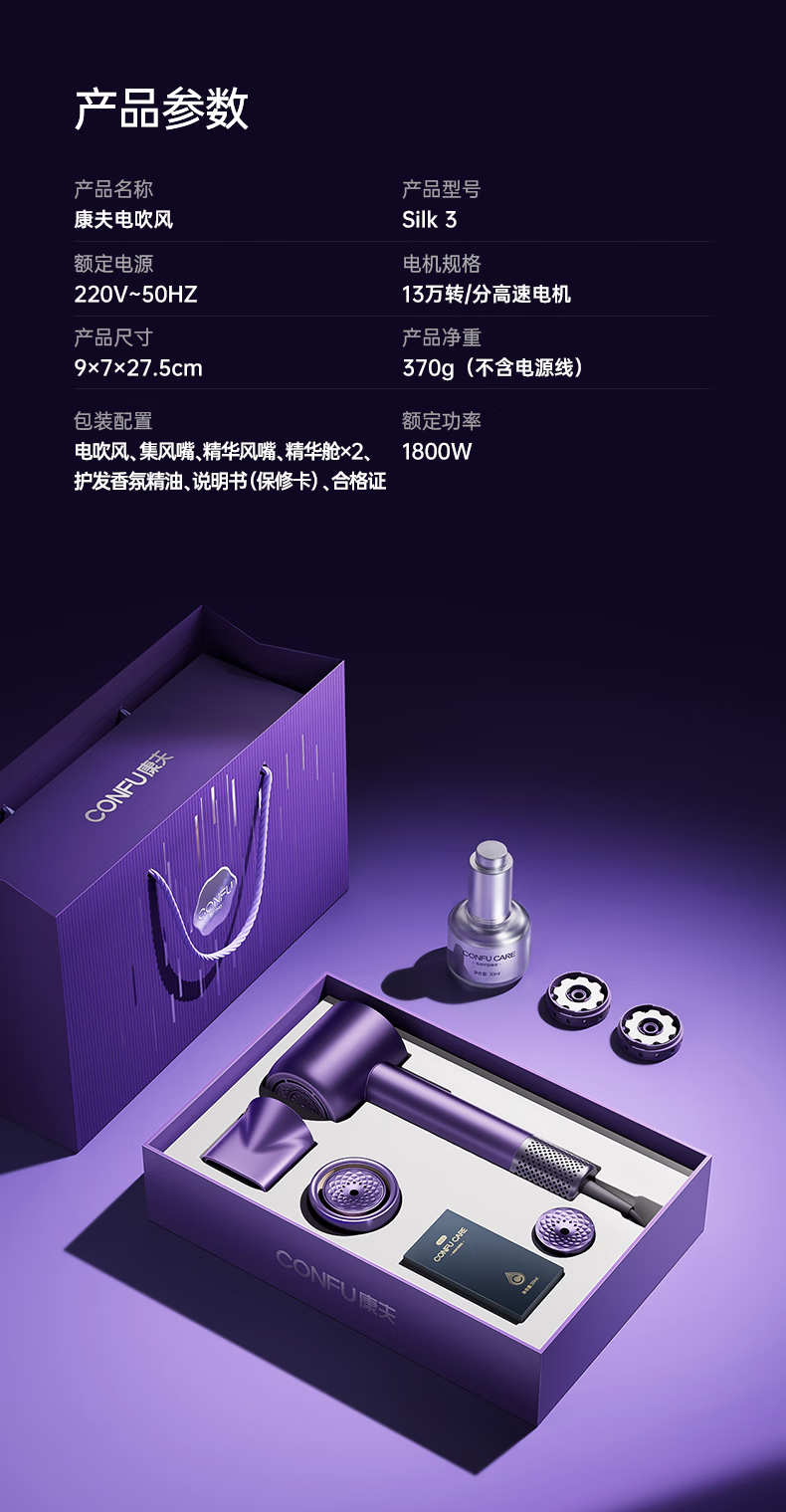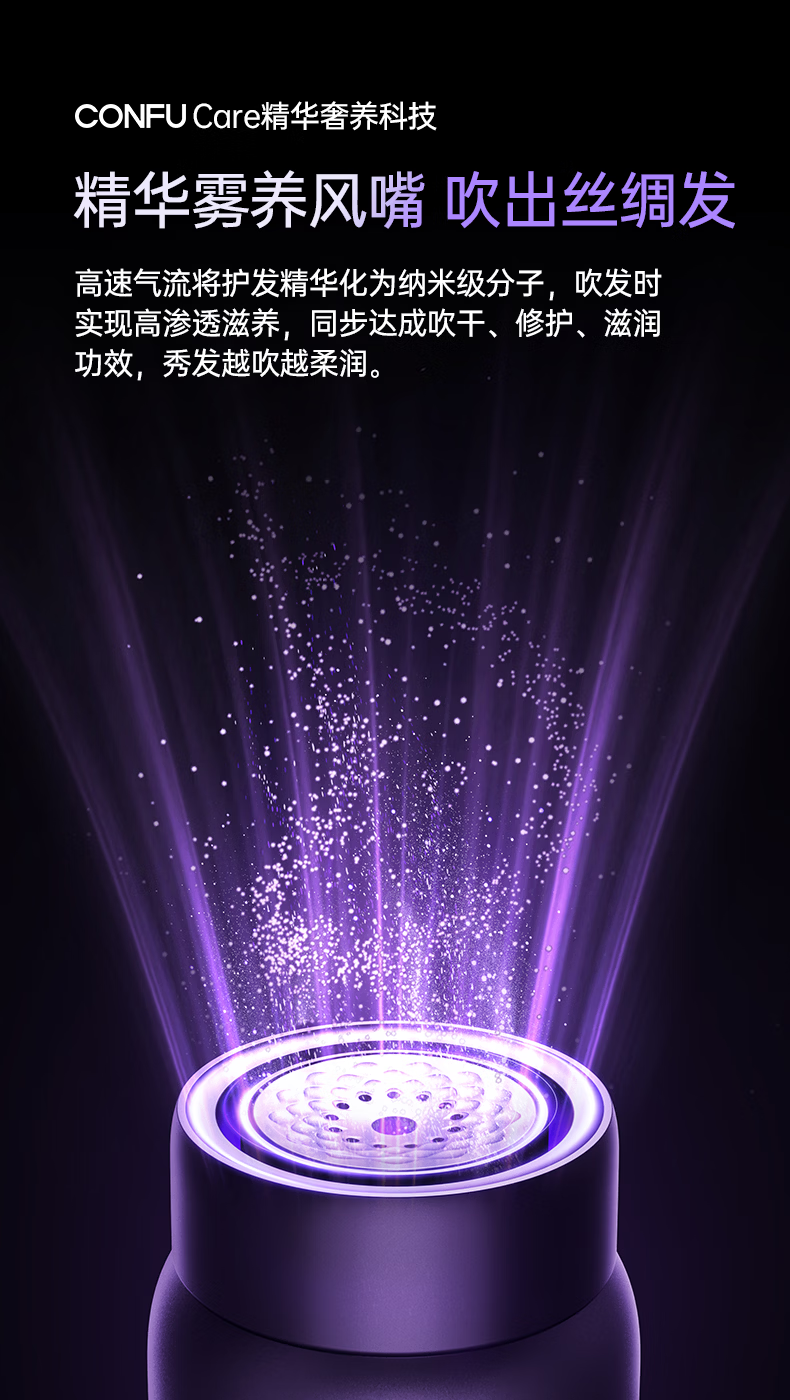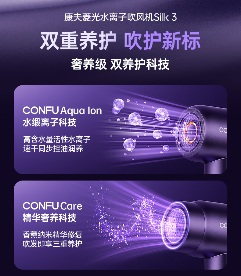 康夫(CONFU)Silk3菱光水离子高速护发吹风机精华润发静音速干13万转家用大功率电吹风筒生日礼物极光紫 养护版