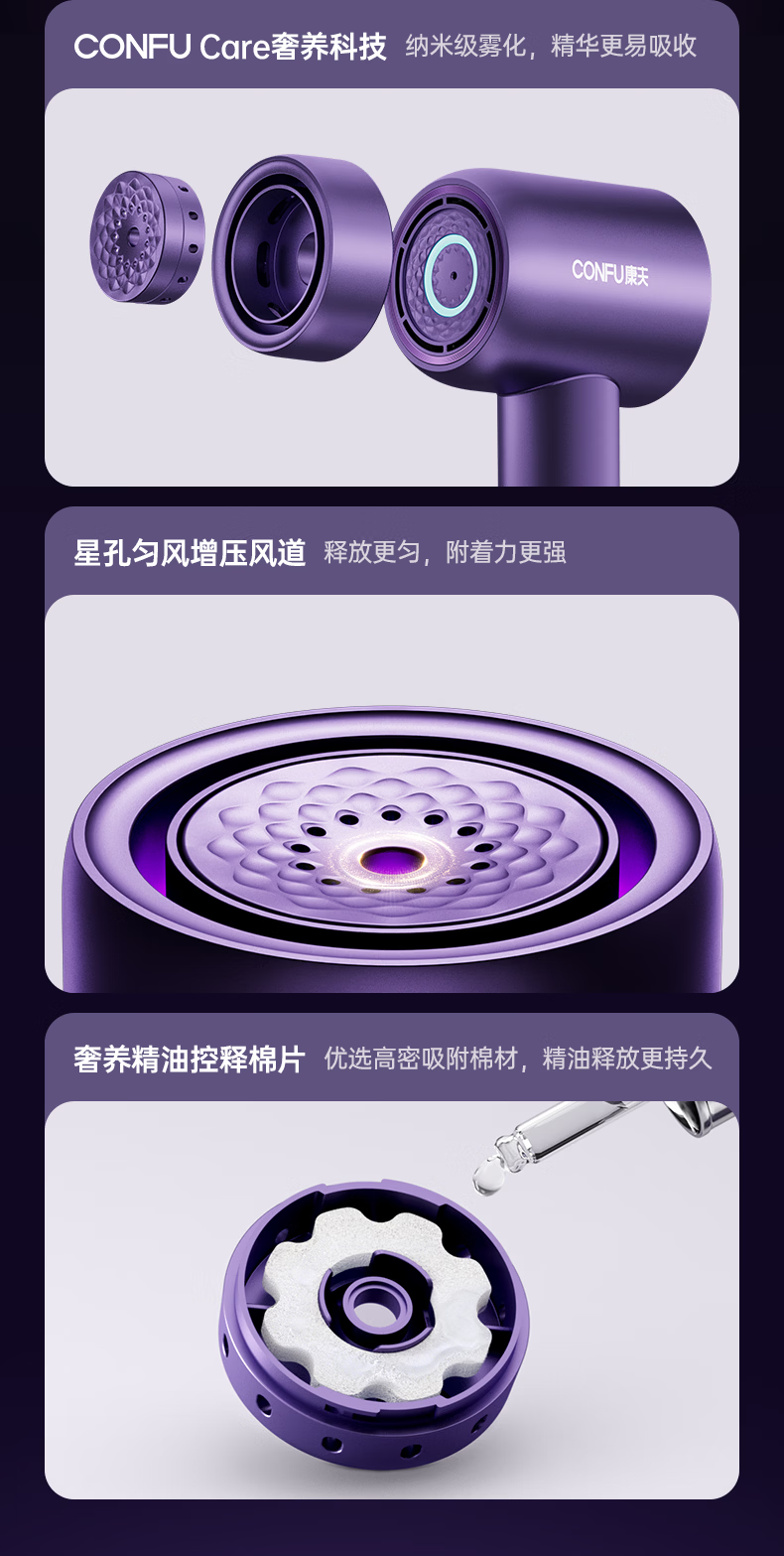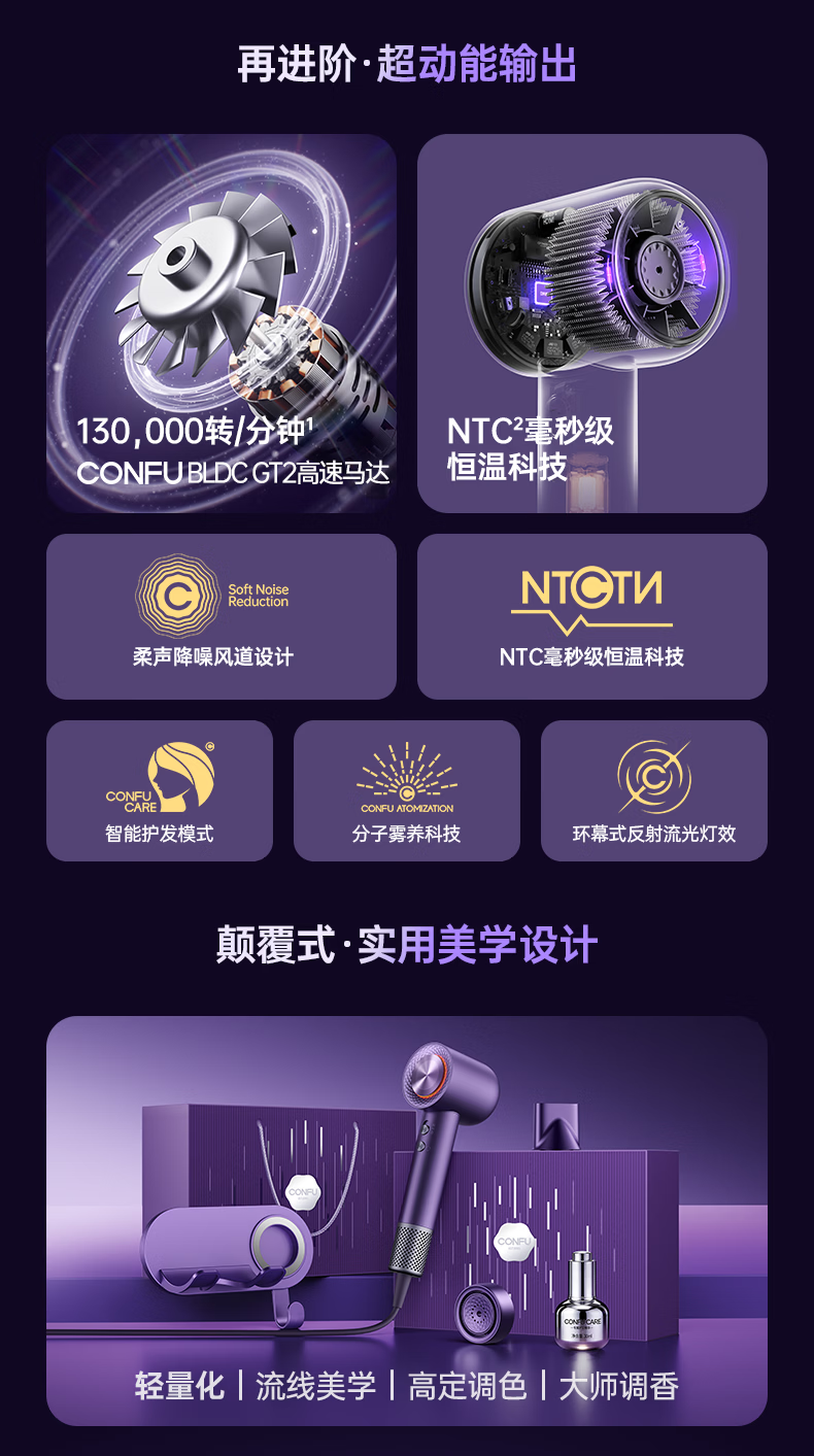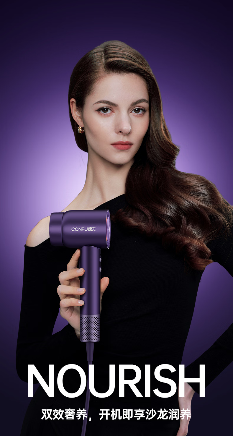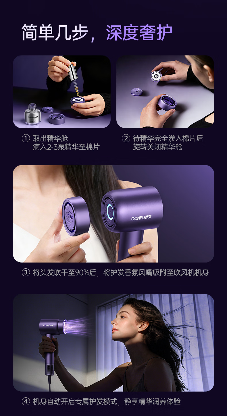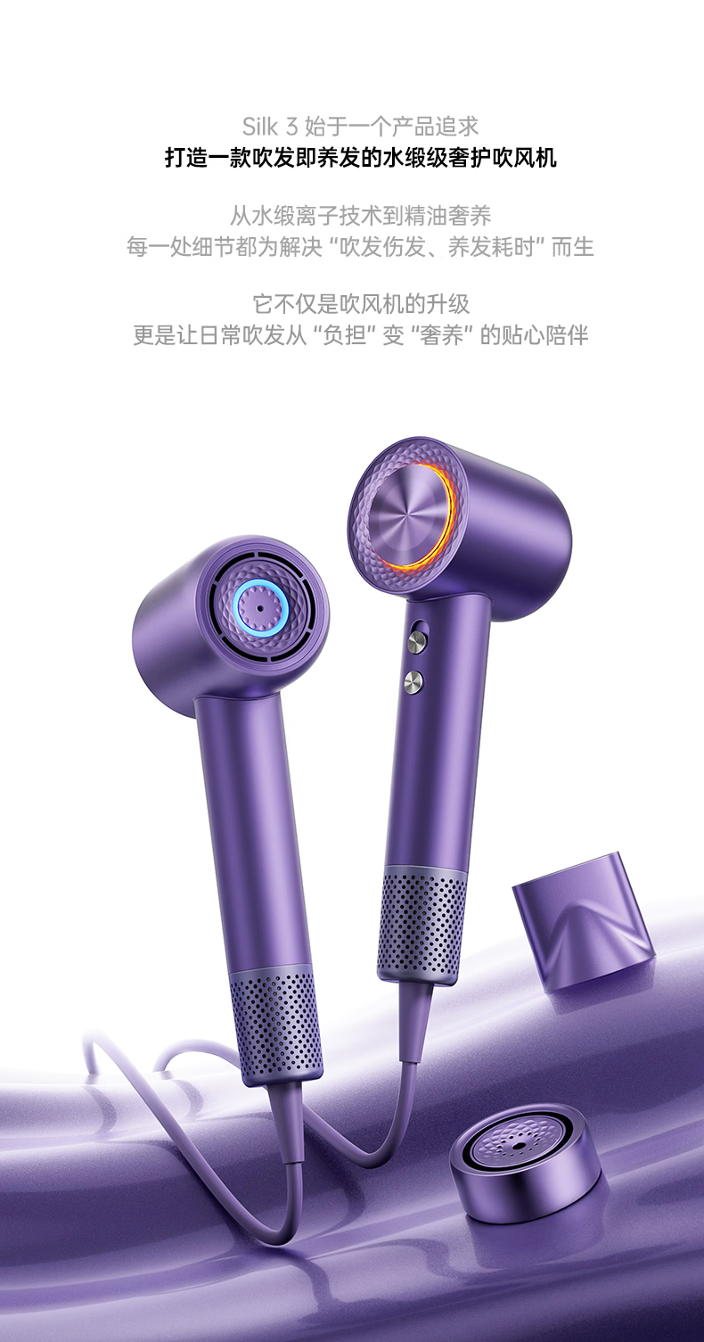 康夫(CONFU)Silk3菱光水离子高速护发吹风机精华润发静音速干13万转家用大功率电吹风筒生日礼物极光紫 养护版