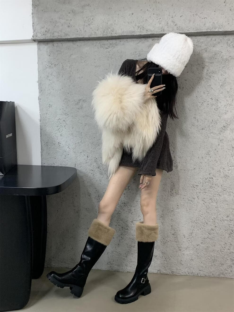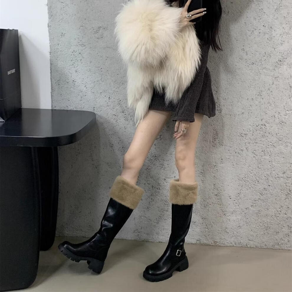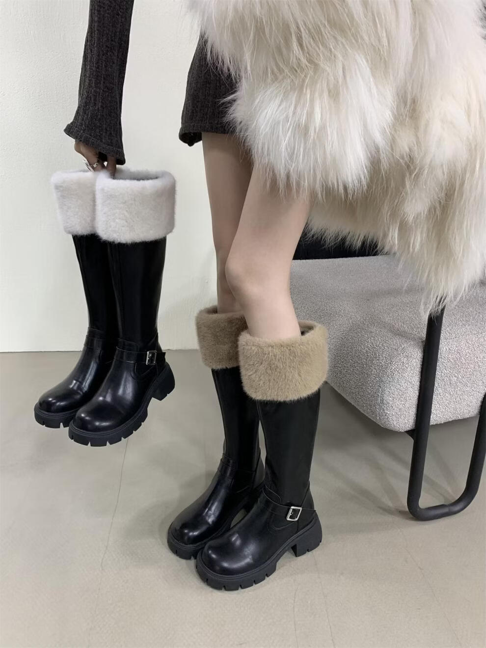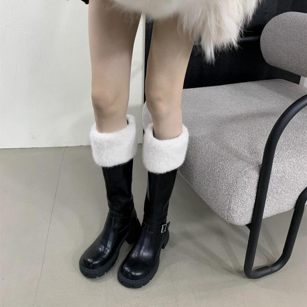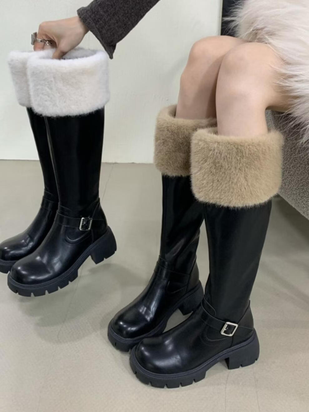 稻草人(MEXICAN)加绒长靴女厚底靴子2026年秋冬季新款女靴不过膝长筒靴粗跟高筒靴 黑白色【升级版】 35