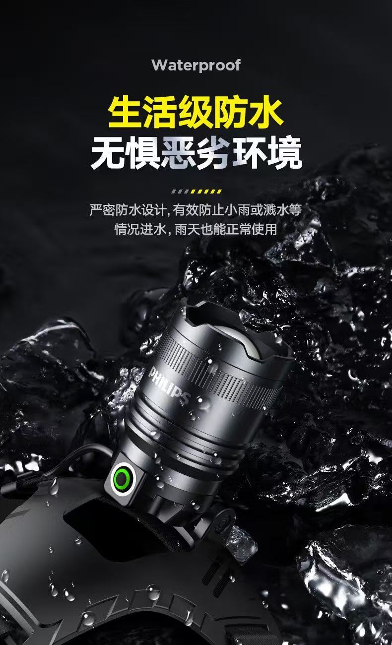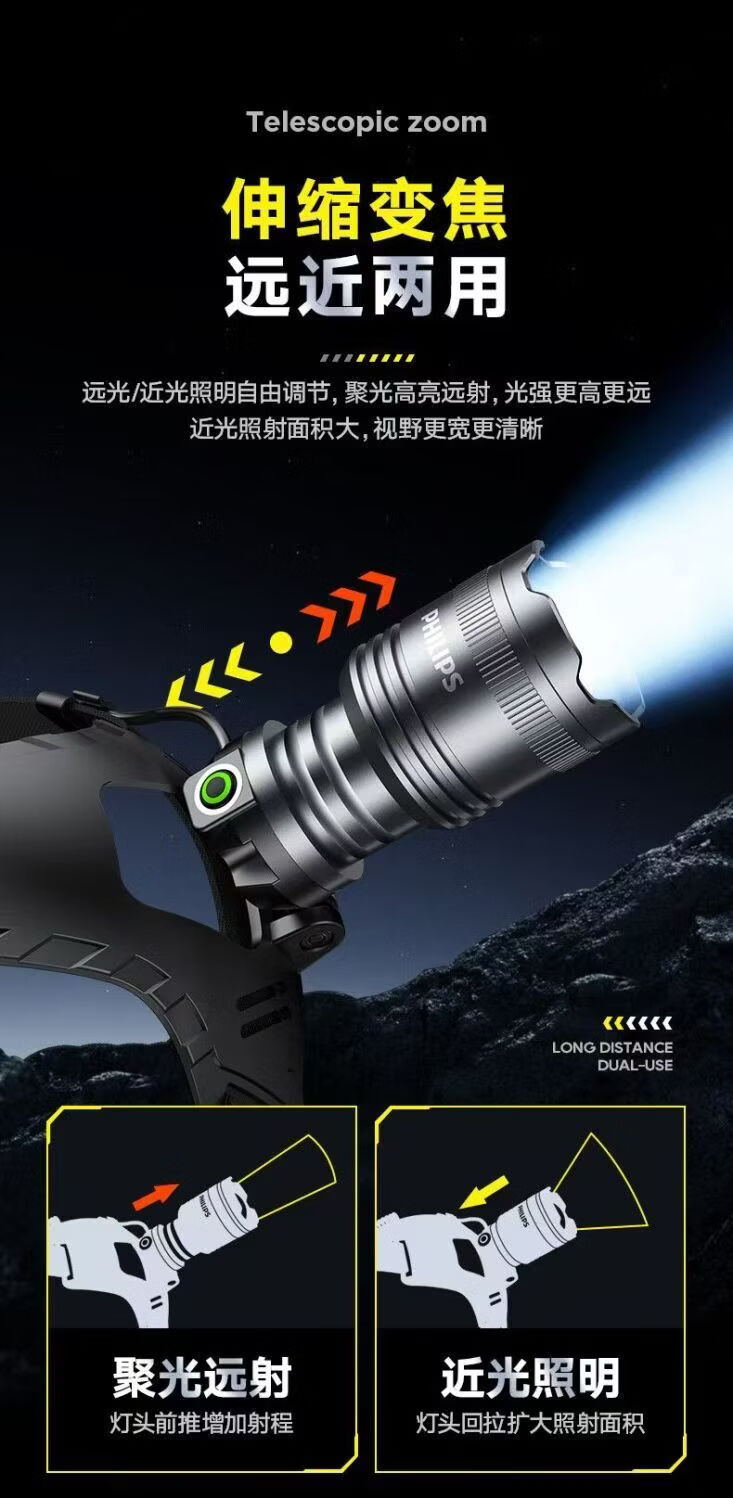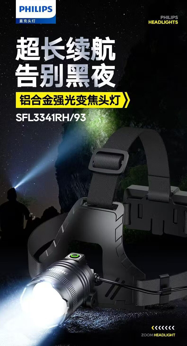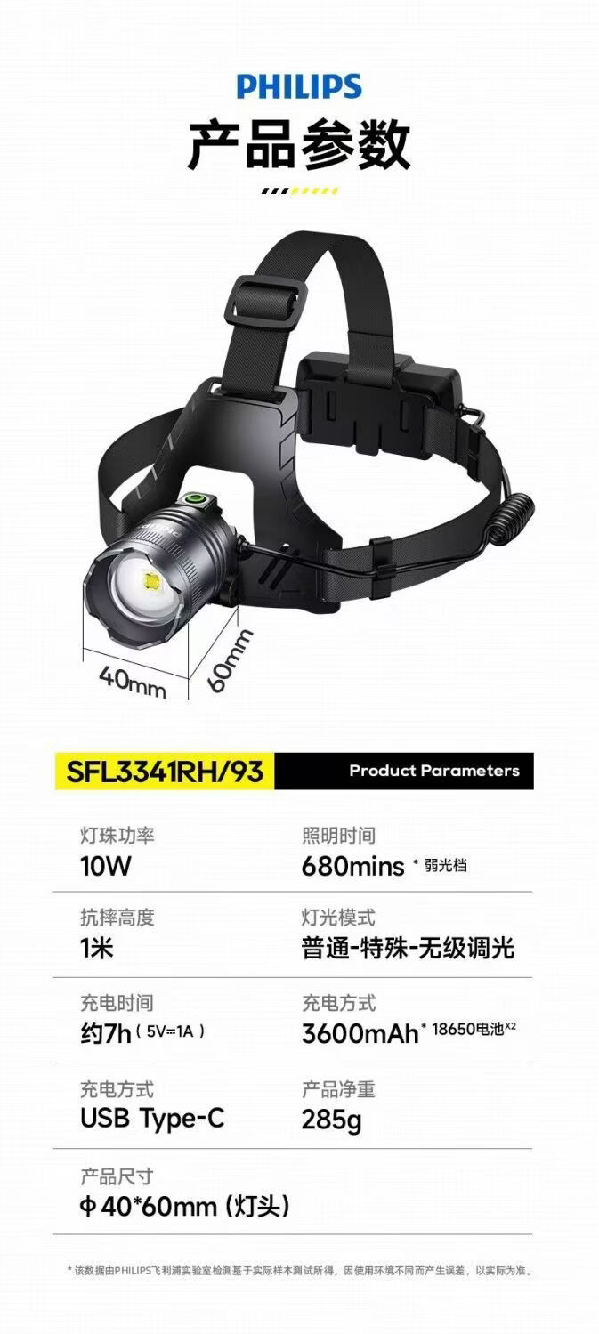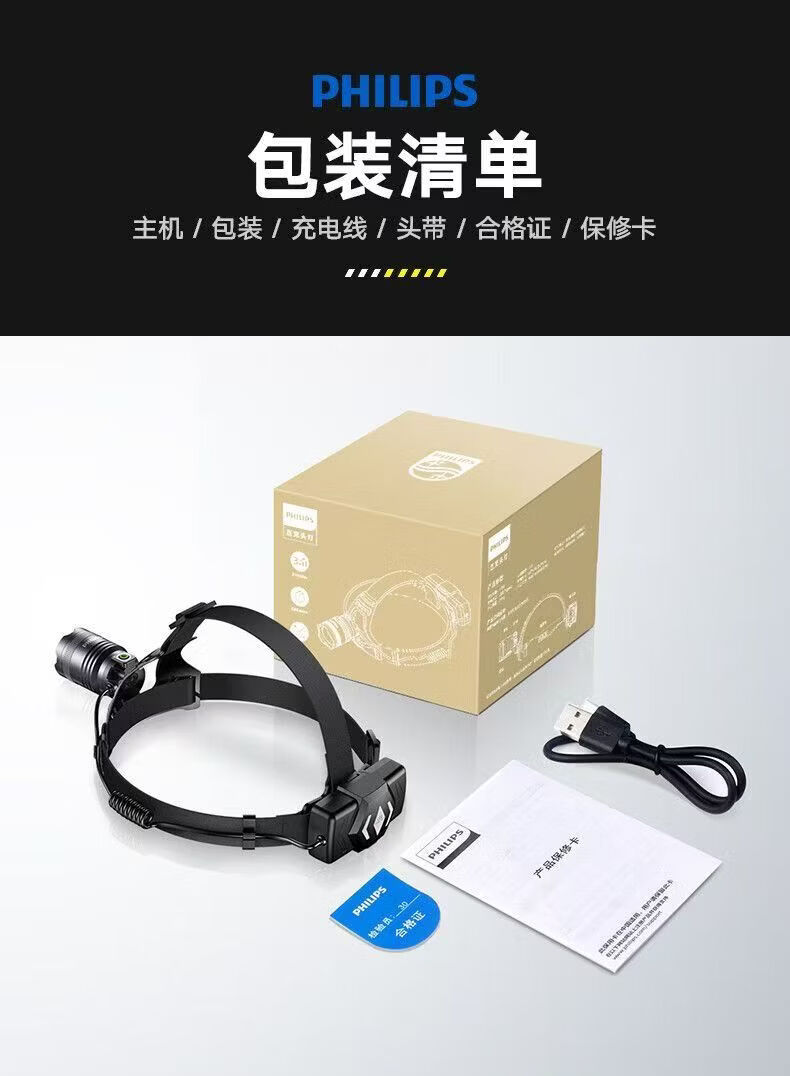 飞利浦(PHILIPS)头灯强光充电头戴式超亮超长续航90度调节垂钓灯SFL3341RH 10W/3600毫安/SFL3341RH