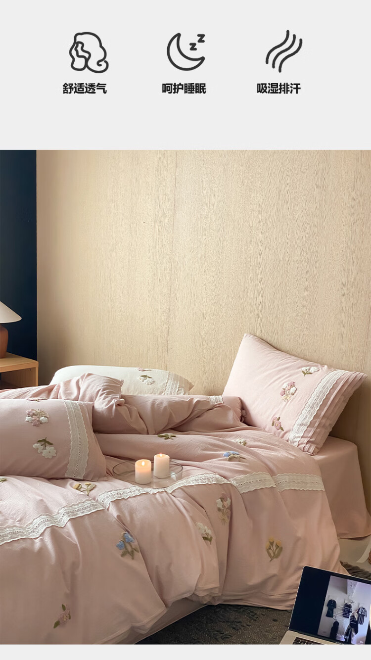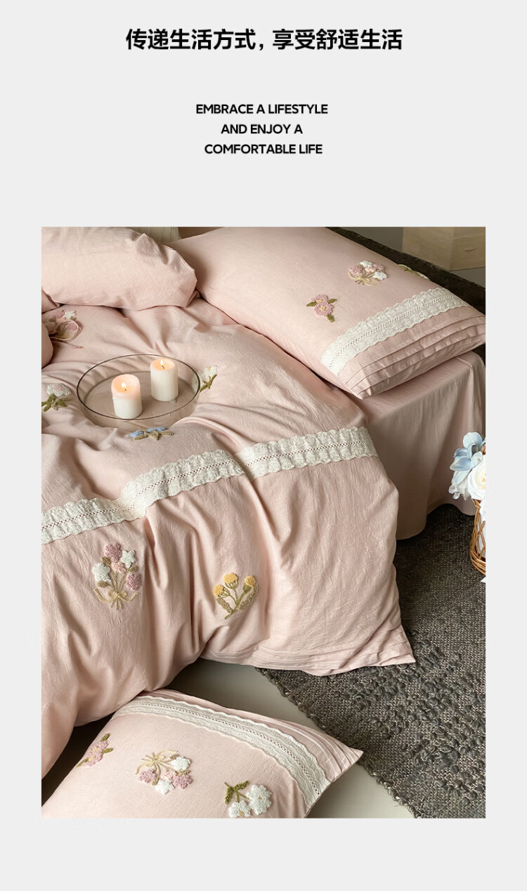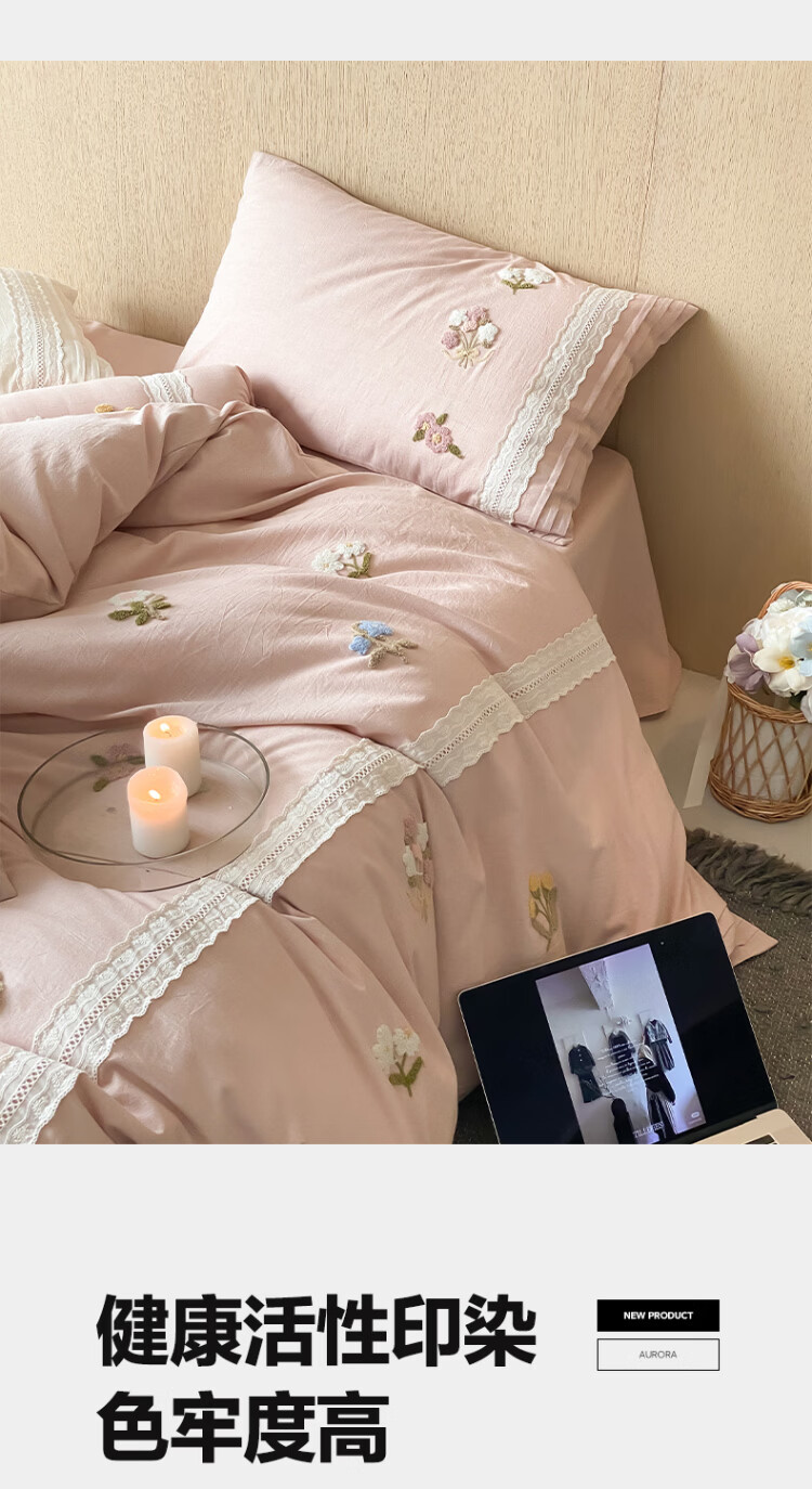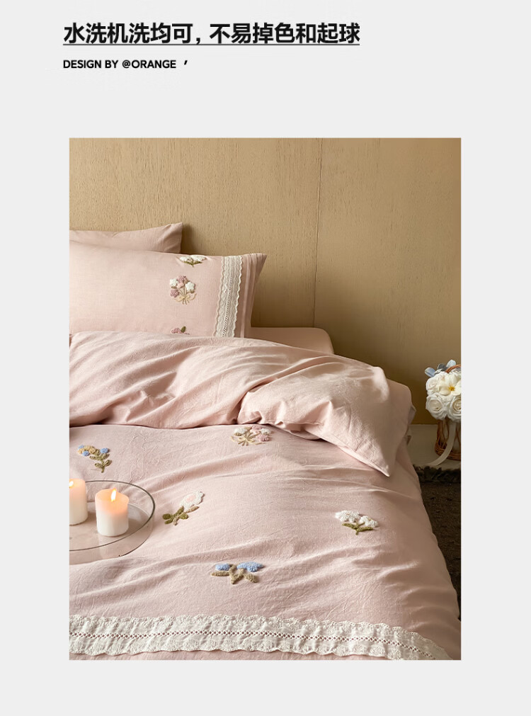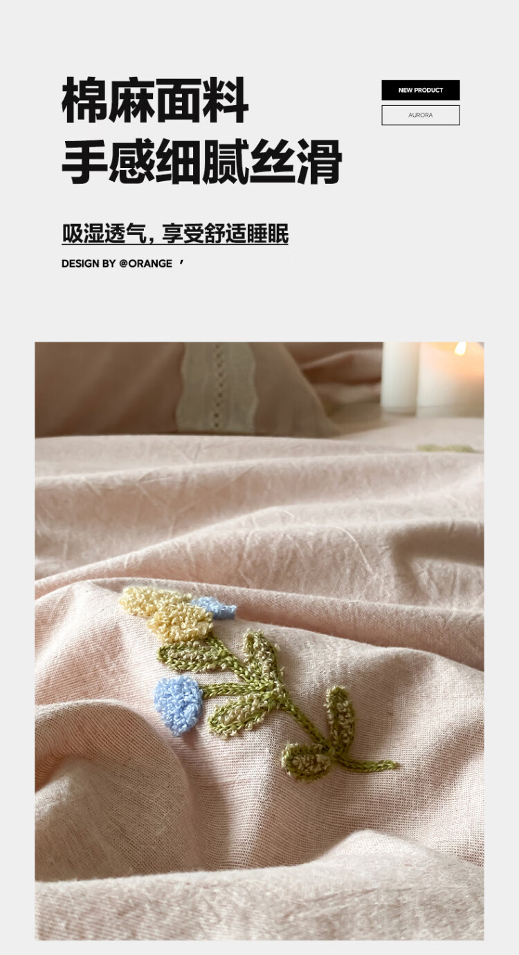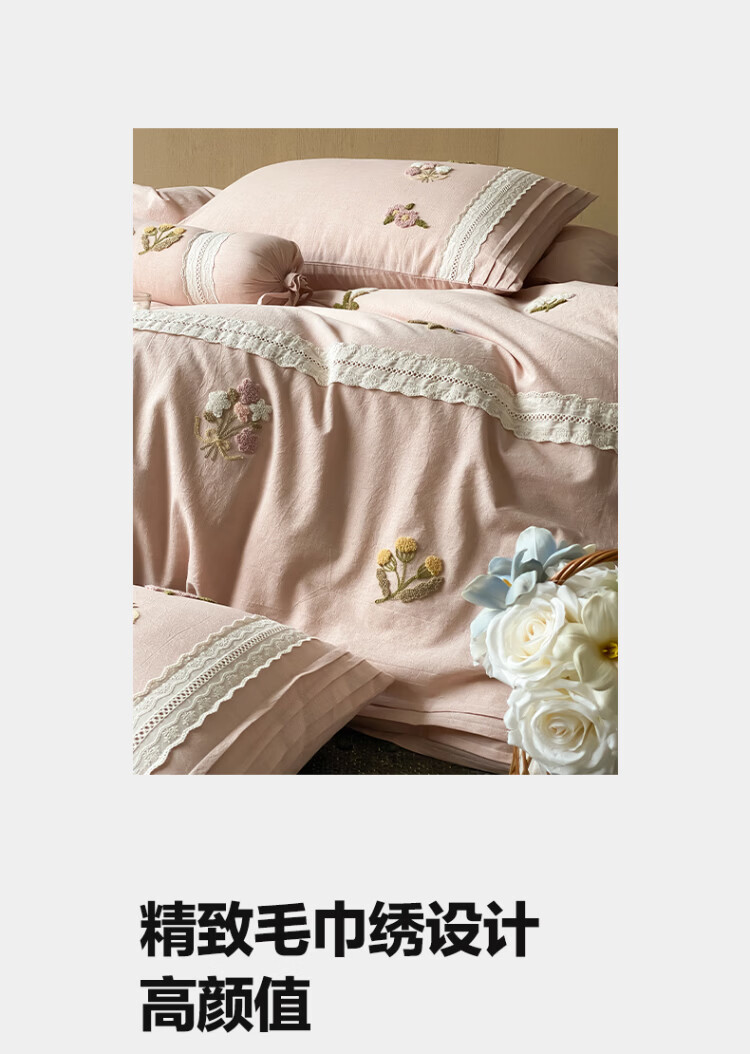 ROLAND LIVE四季床上用品棉麻立体毛巾绣四件套裸睡透气被套床单家用1.8米床 MX 棉麻四件套-一隅花町豆沙色 1.5米床 床单款 【被套200*230cm】