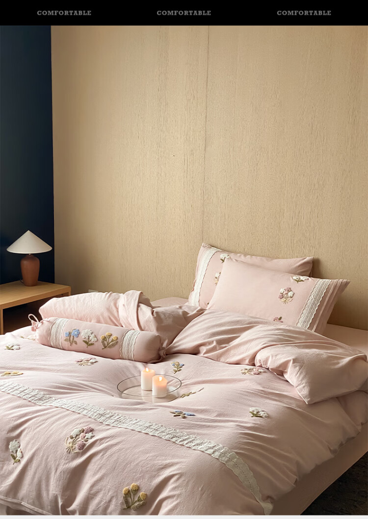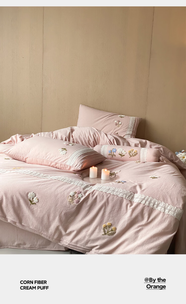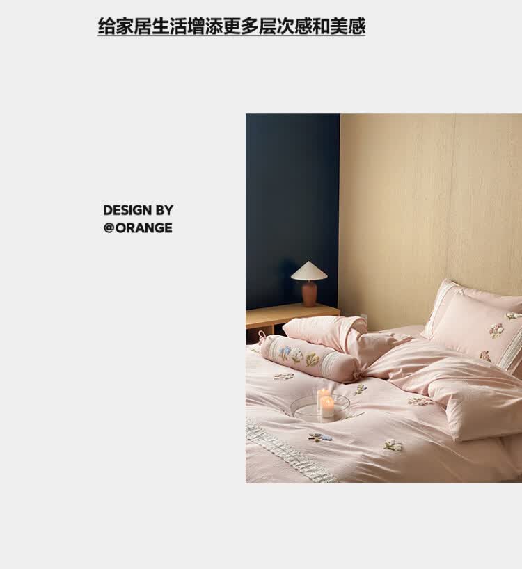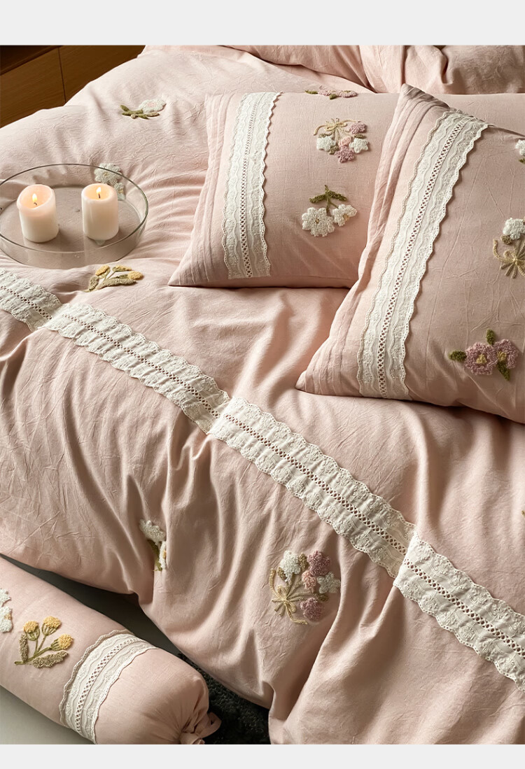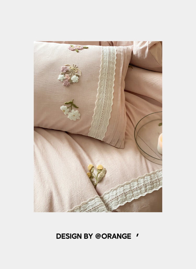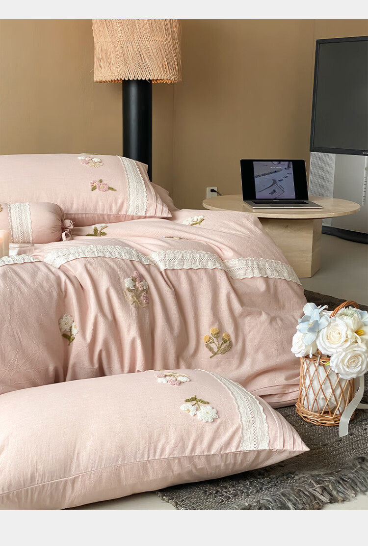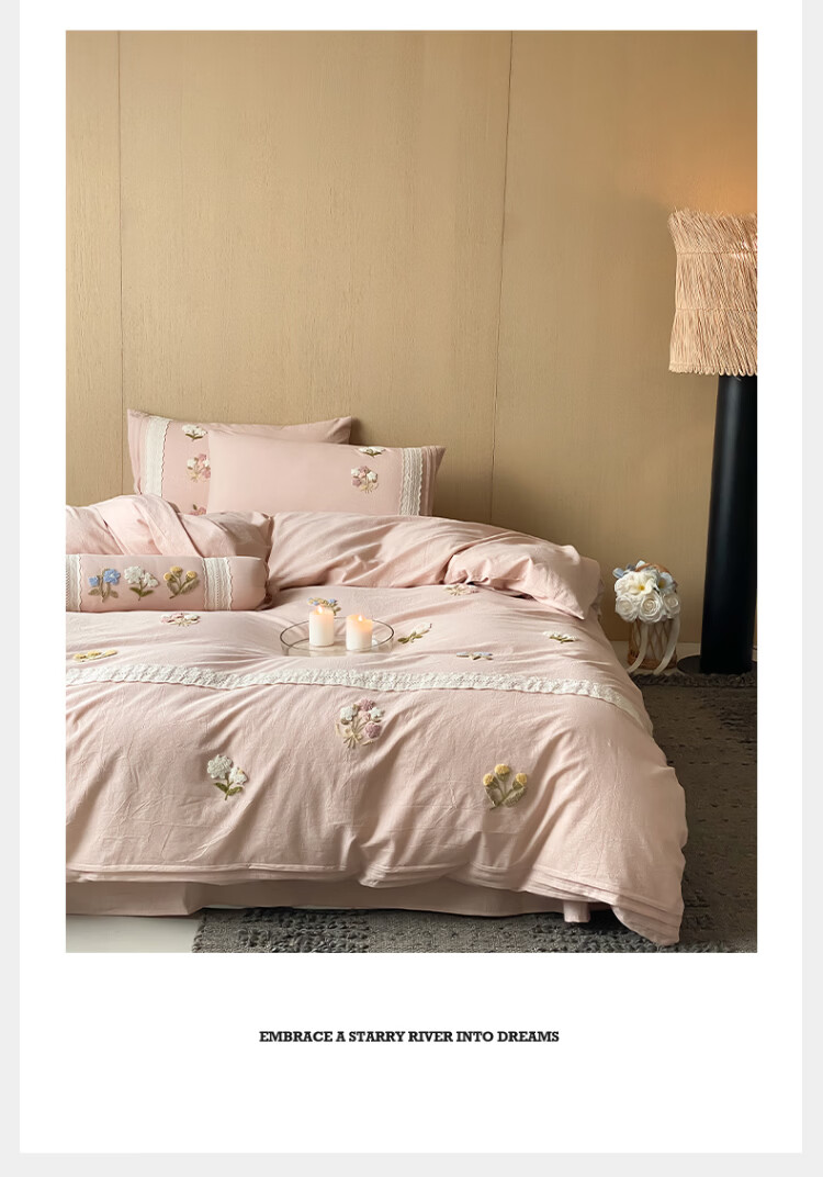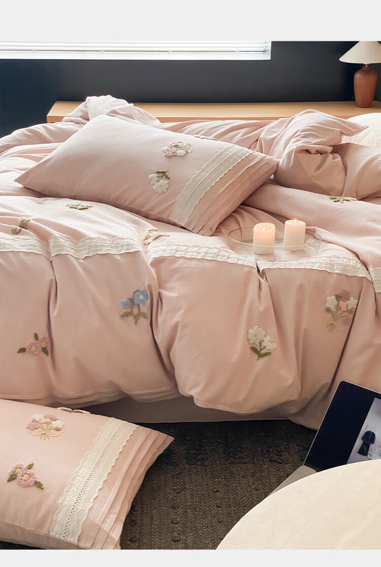 ROLAND LIVE四季床上用品棉麻立体毛巾绣四件套裸睡透气被套床单家用1.8米床 MX 棉麻四件套-一隅花町豆沙色 1.5米床 床单款 【被套200*230cm】