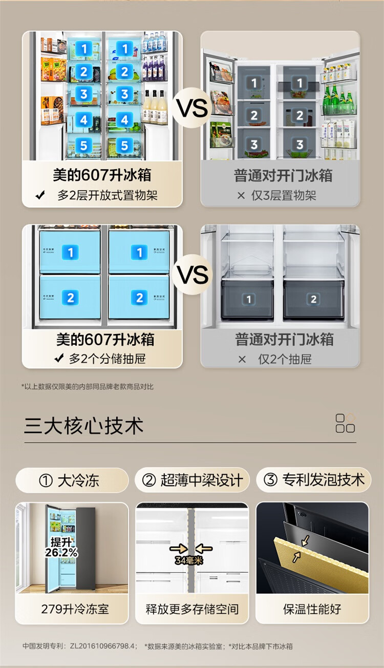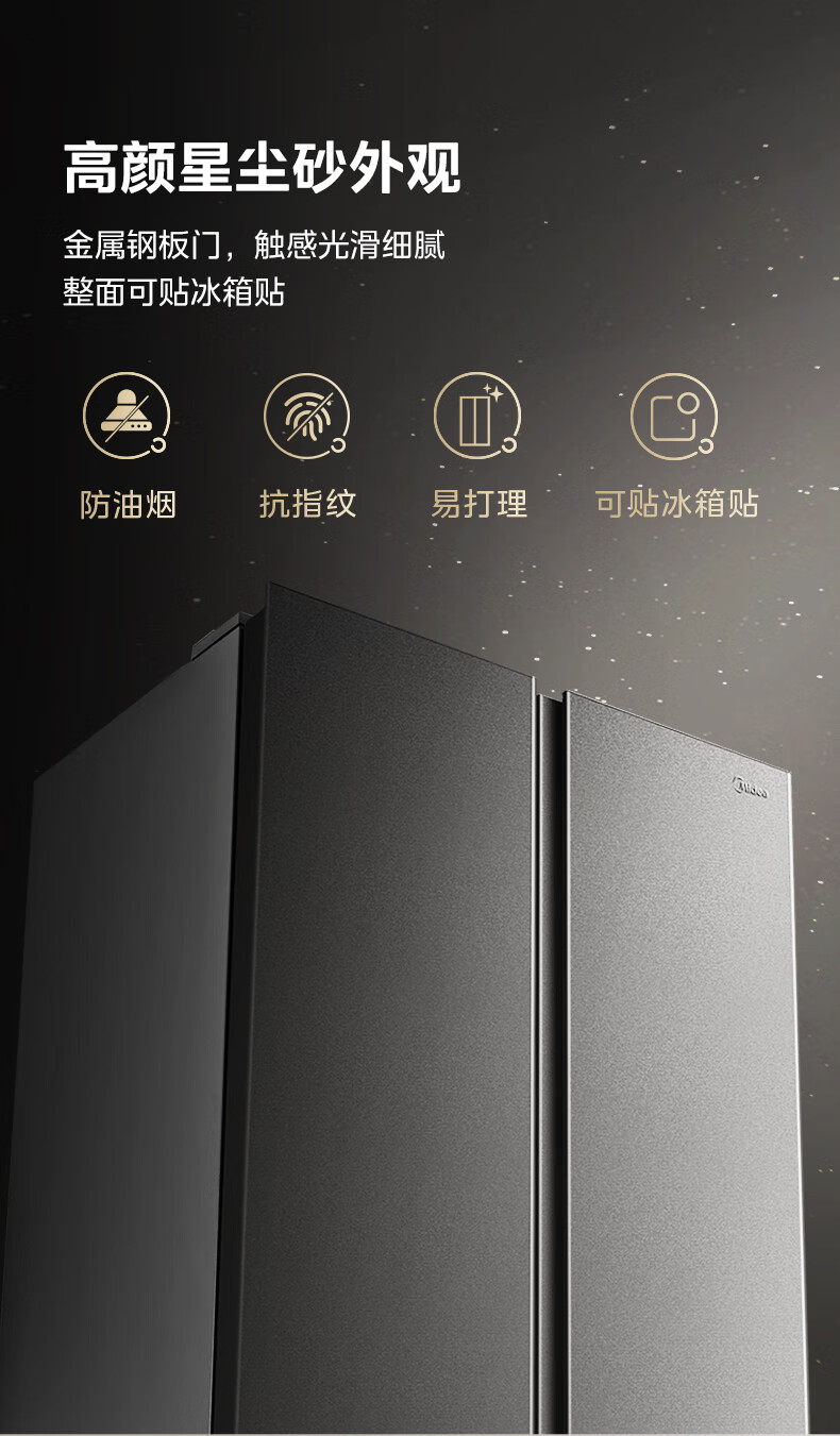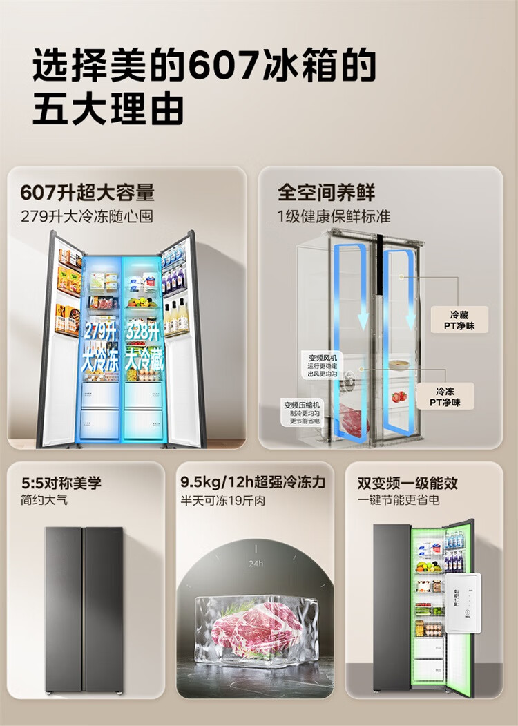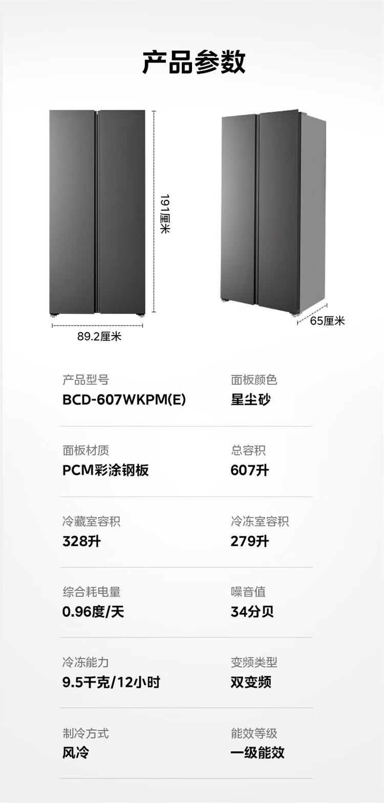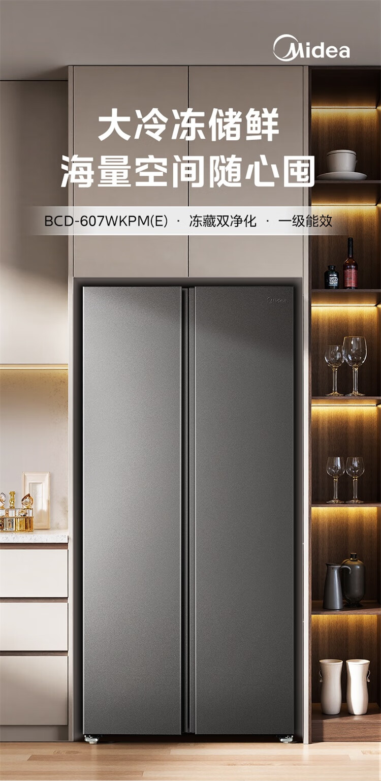 美的(Midea)607升pro升级款双开门冰箱超大容量一级能效风冷无霜大冷冻星辰砂BCD-607WKPM(E)以旧换新国家补贴