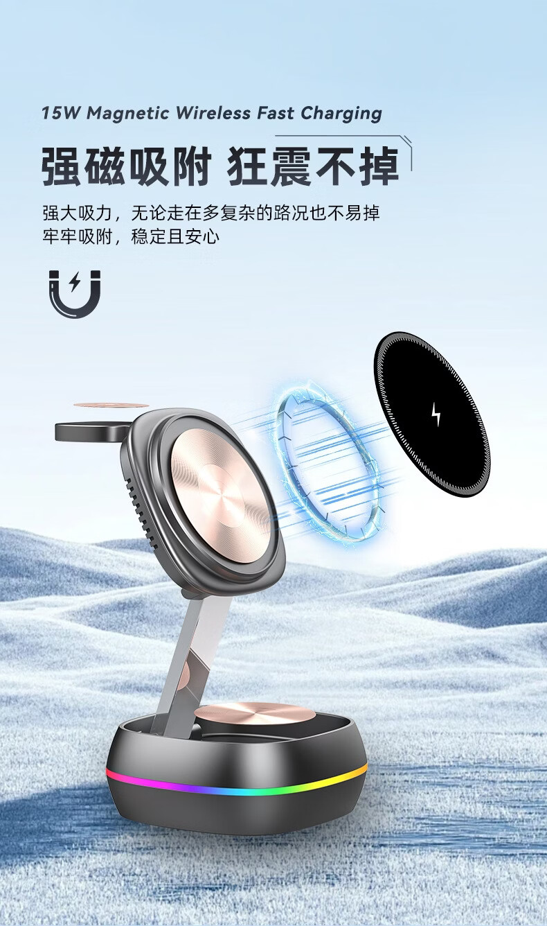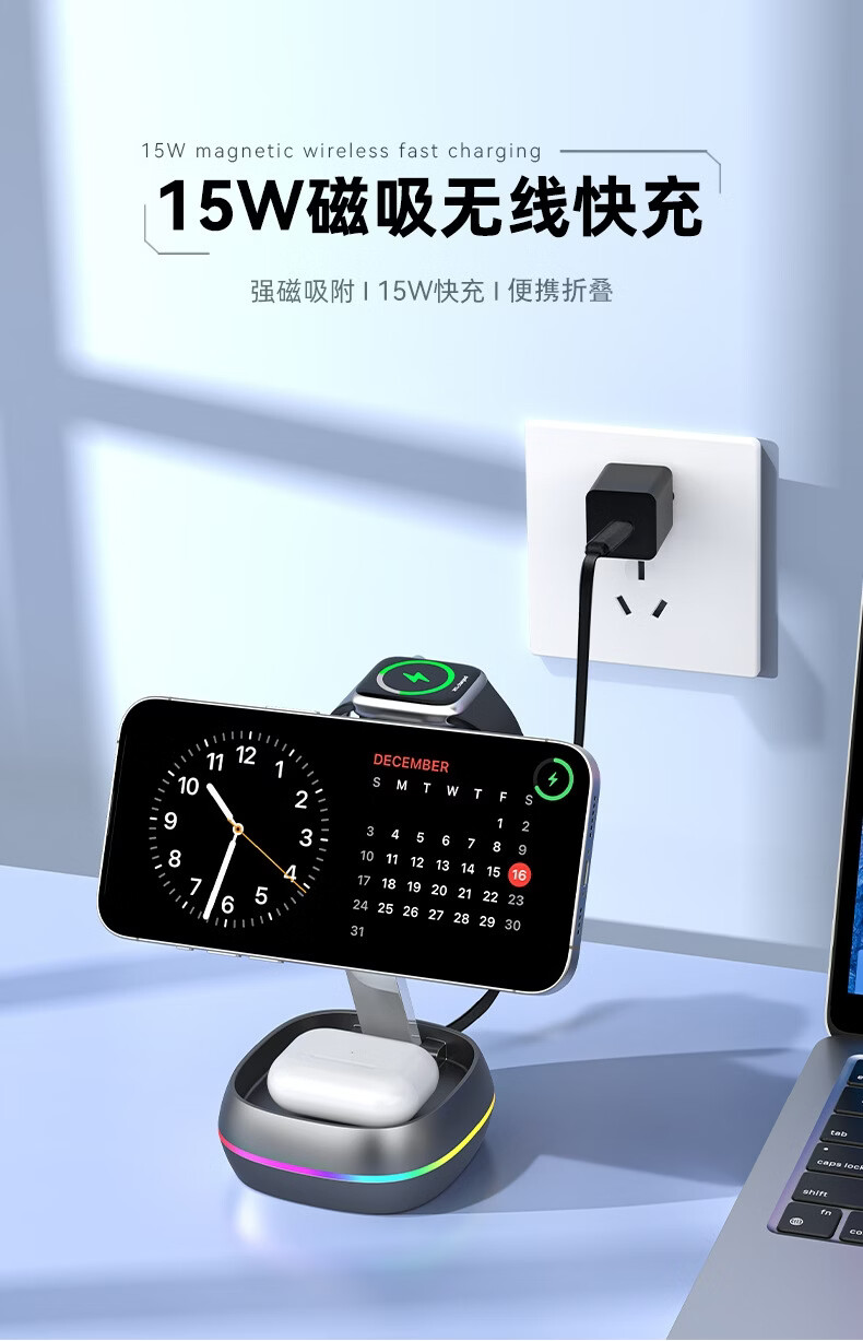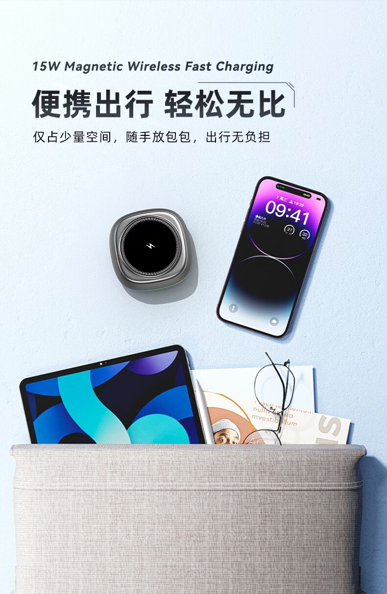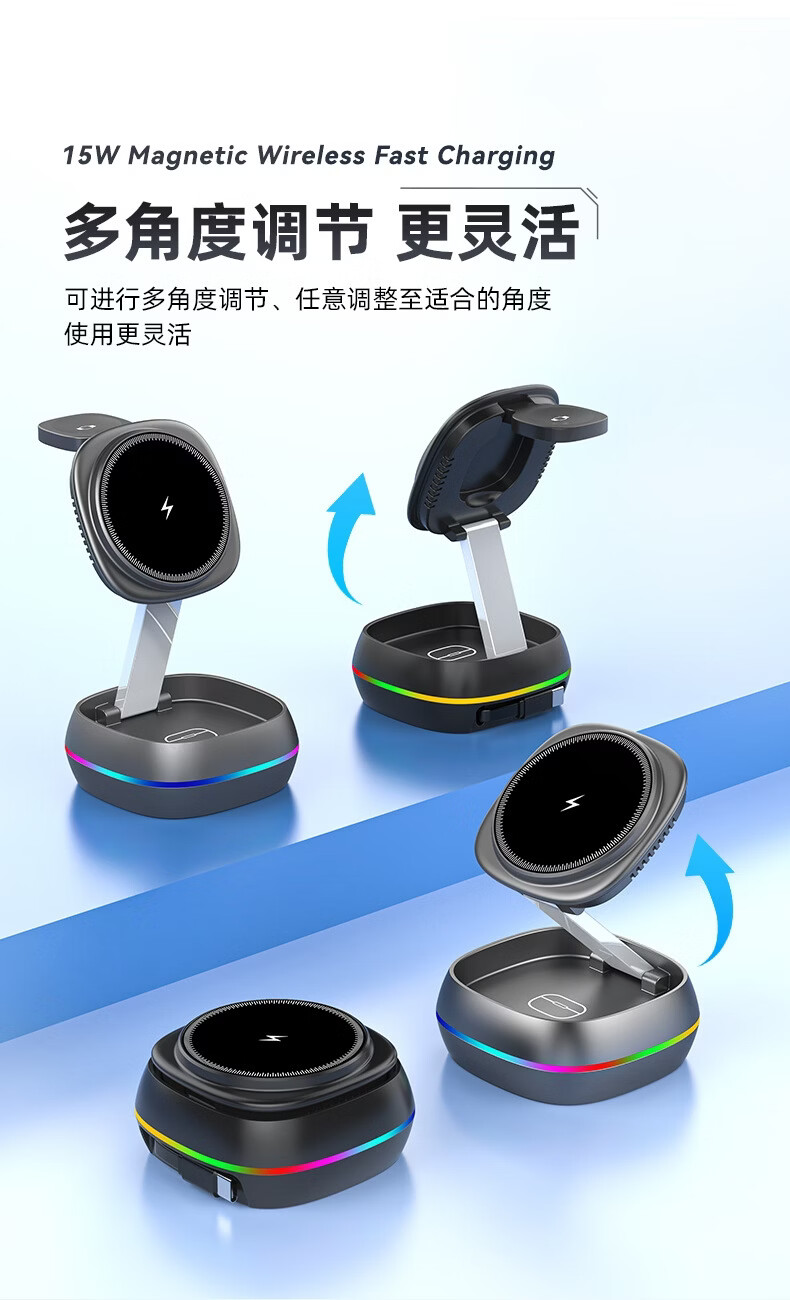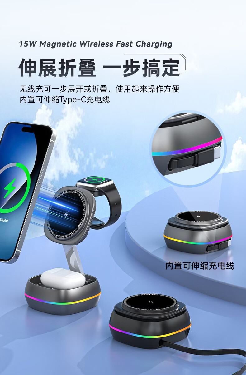 RLRZ三合一磁吸无线充电器自带线折叠收纳便携适用苹果17 iPhone16耳机手表Magsafe无线充立式支架底座 金属灰【3合1磁吸无线充】