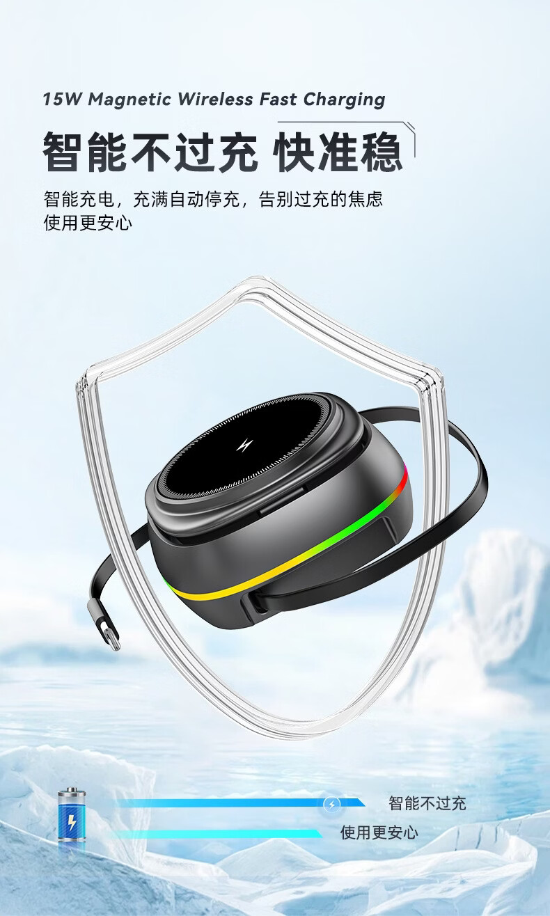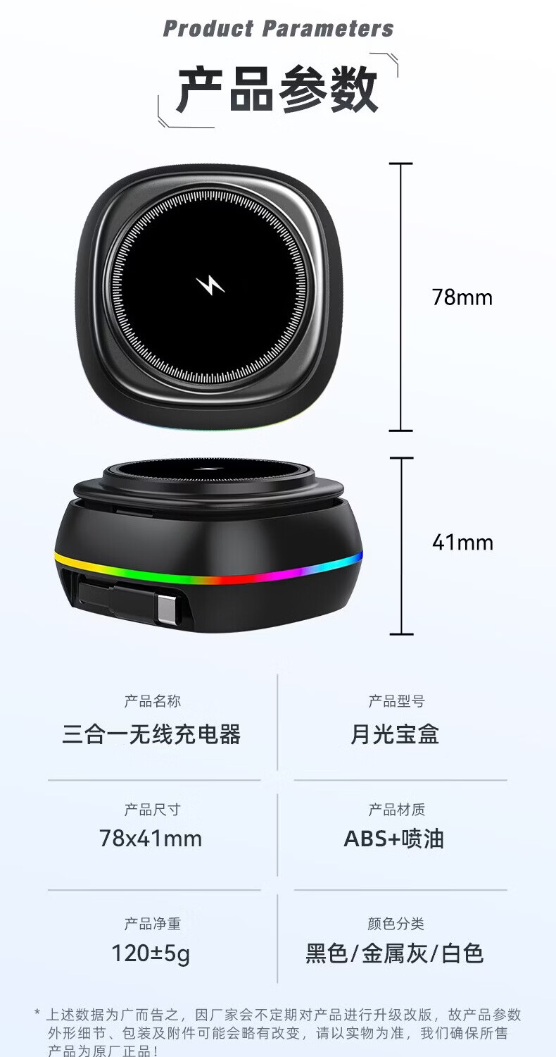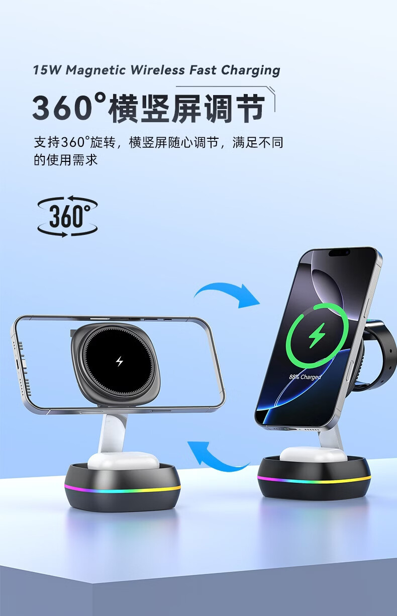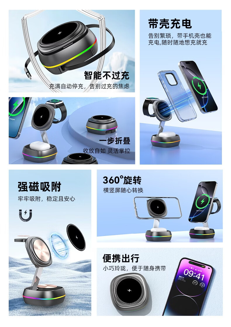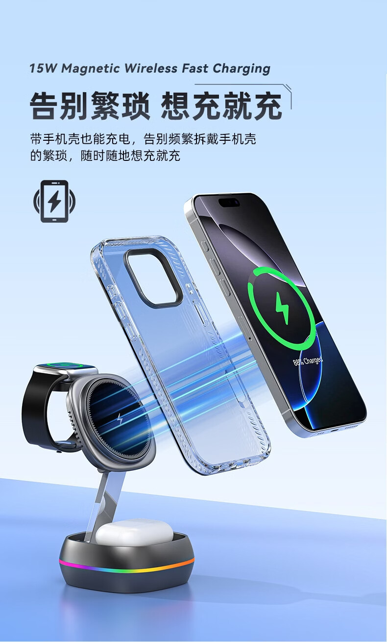 RLRZ三合一磁吸无线充电器自带线折叠收纳便携适用苹果17 iPhone16耳机手表Magsafe无线充立式支架底座 金属灰【3合1磁吸无线充】