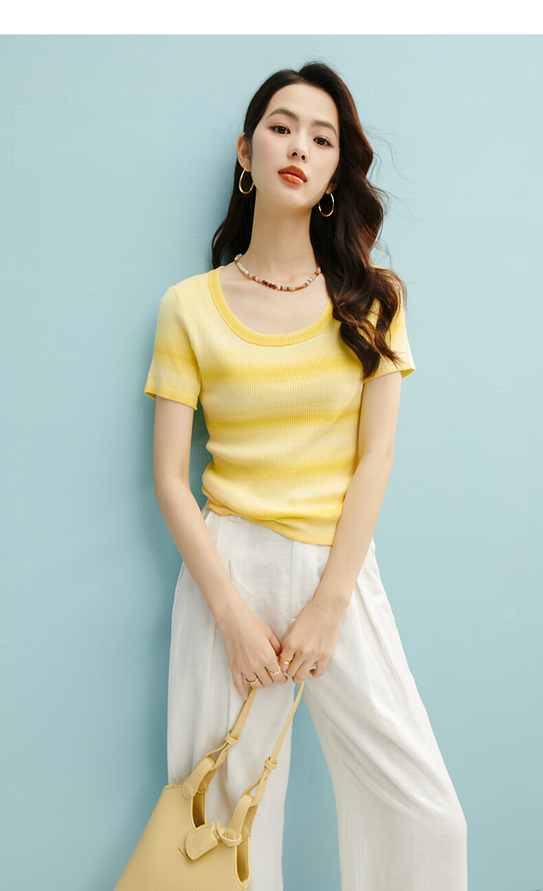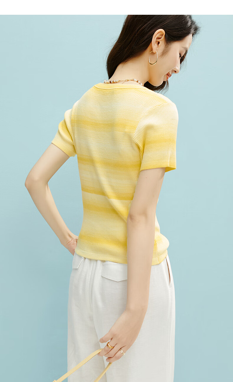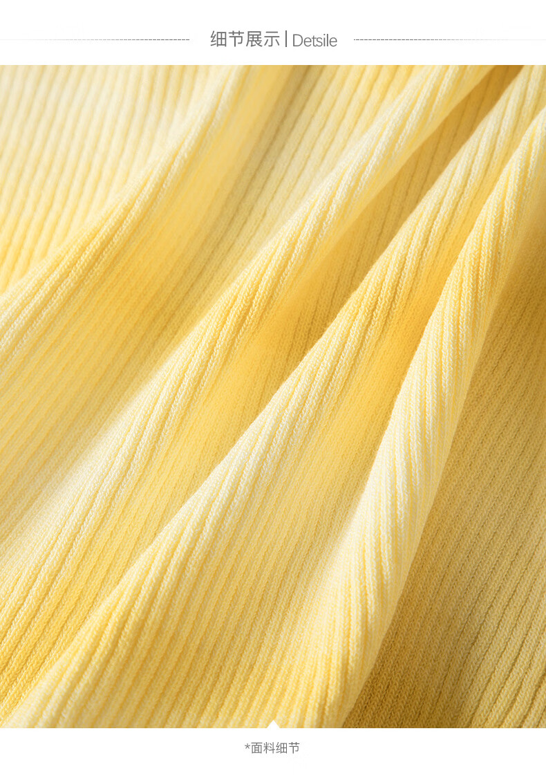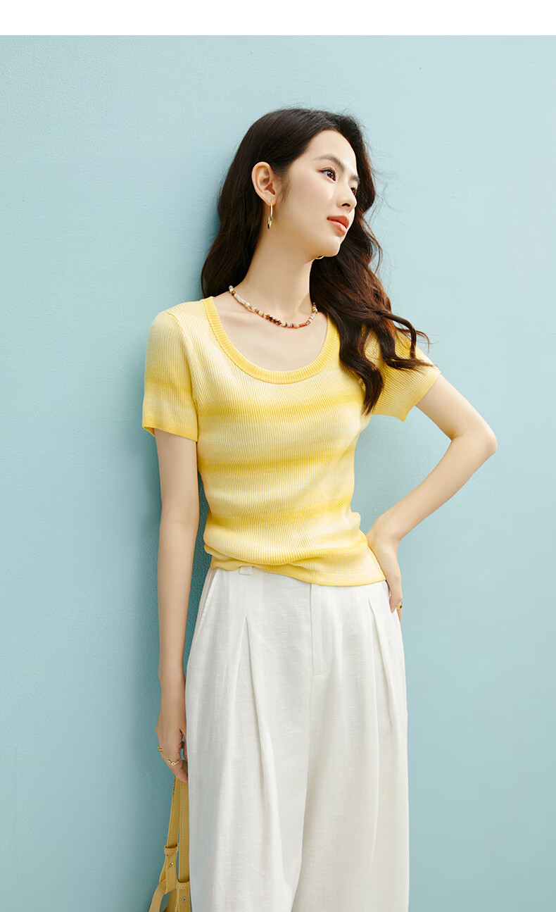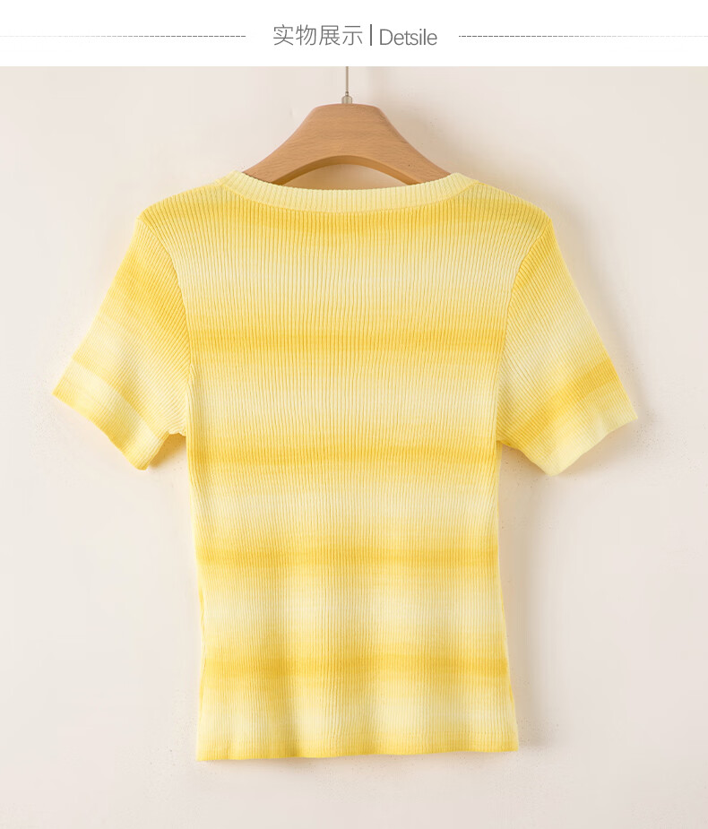 晚白2026夏款时尚竖纹肌理短袖上衣弹力修身冰丝凉感针织T女 黄色 S
