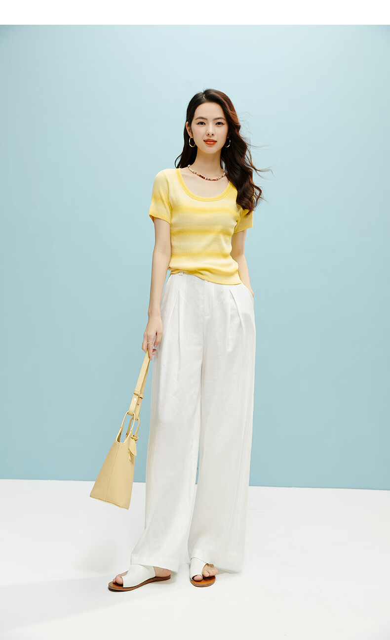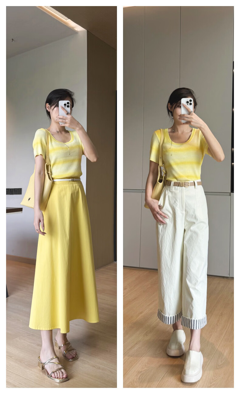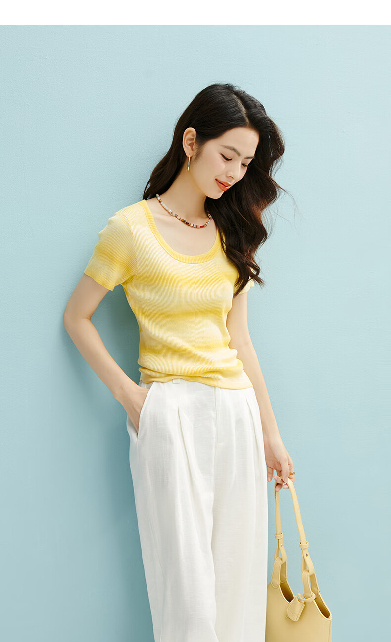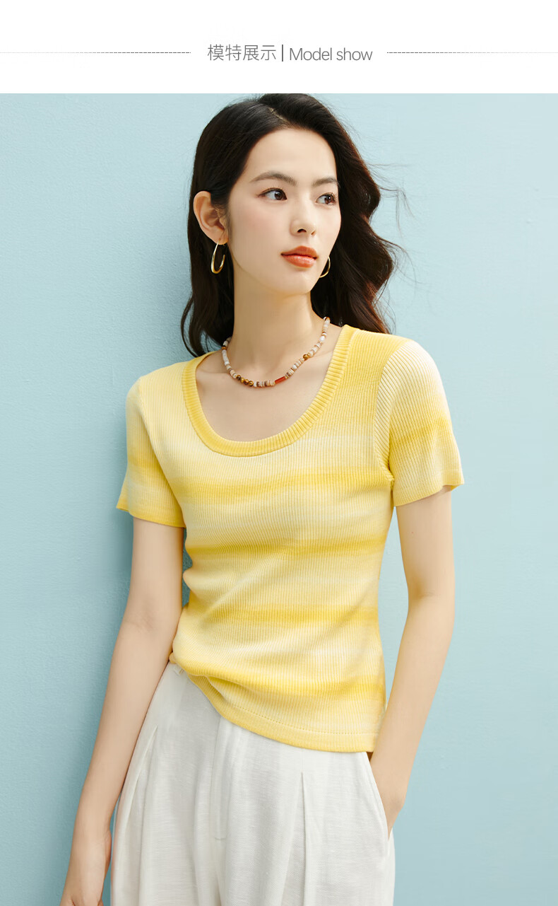 晚白2026夏款时尚竖纹肌理短袖上衣弹力修身冰丝凉感针织T女 黄色 S