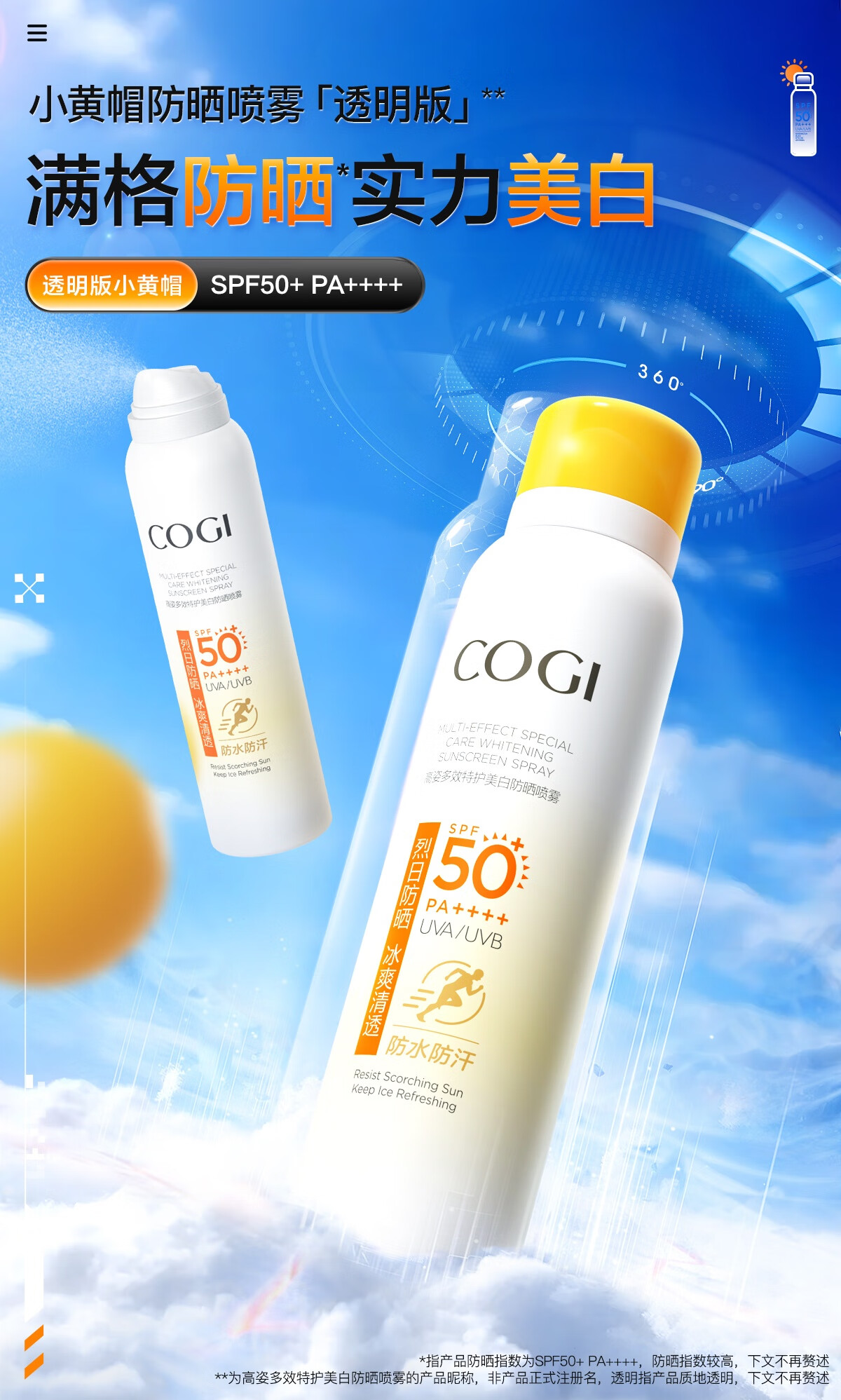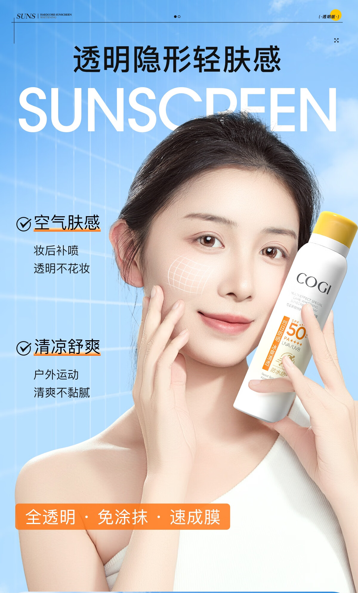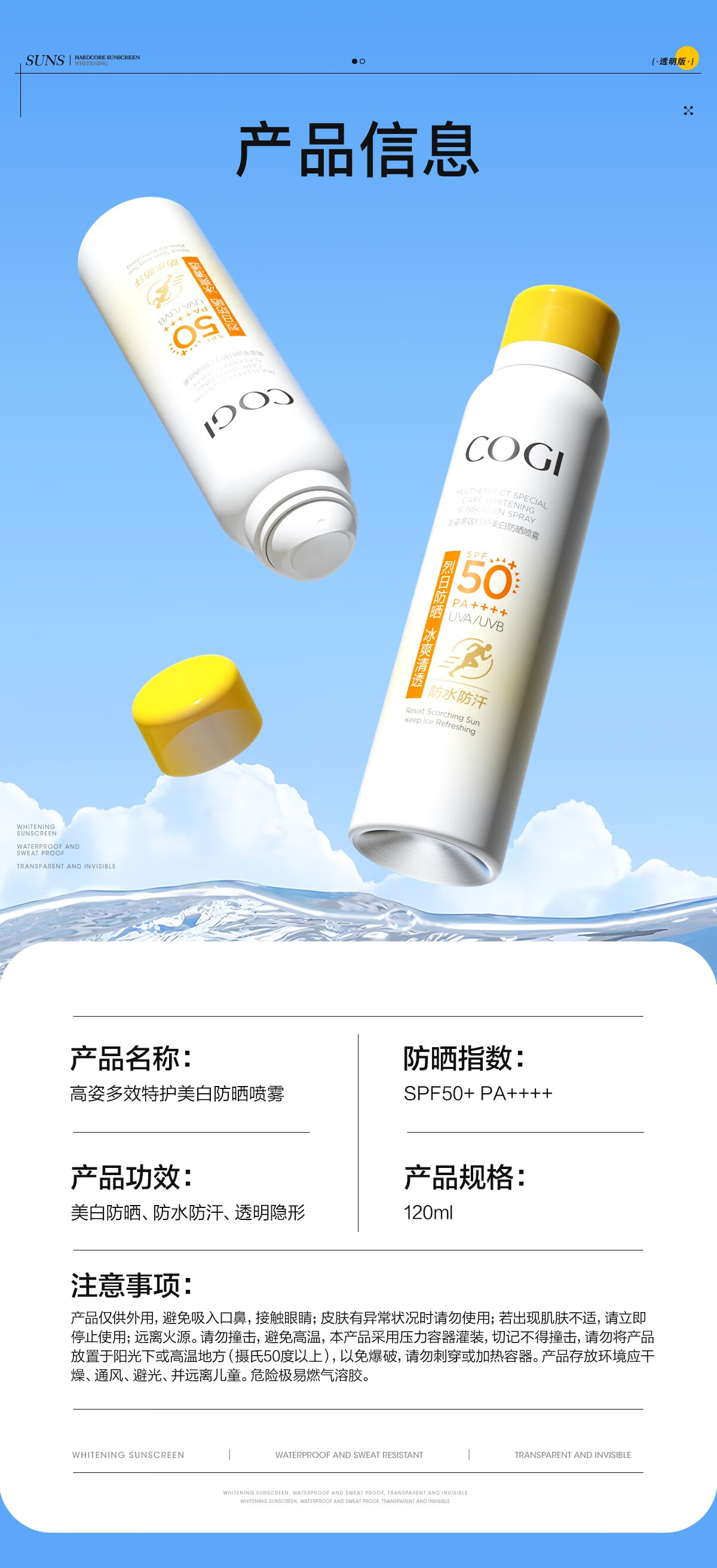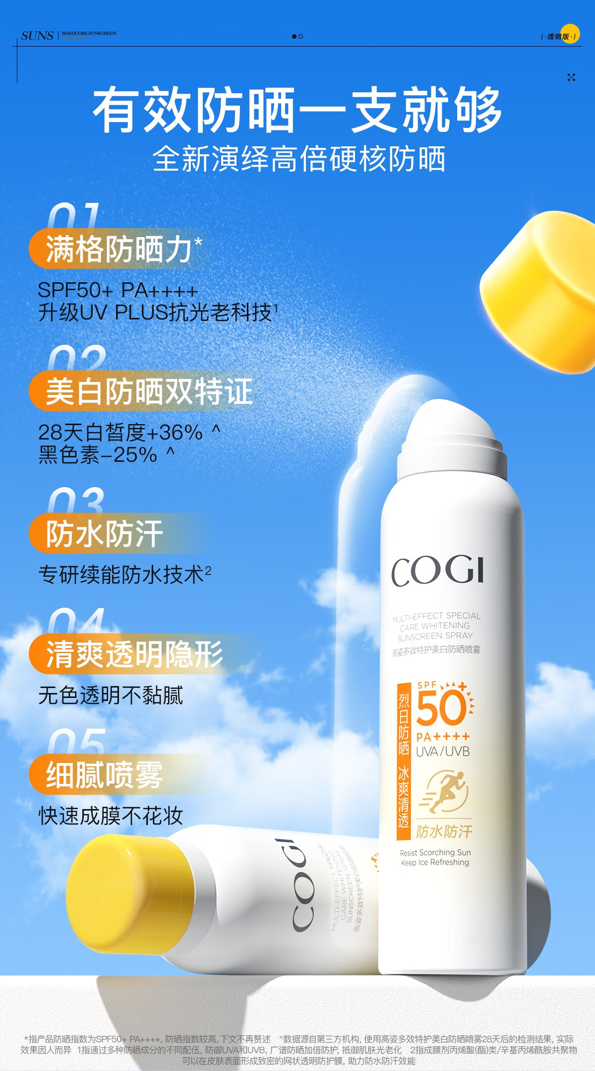 高姿透明防晒喷雾120mlSPF50+PA++++防水防汗美白防晒军训户外便携