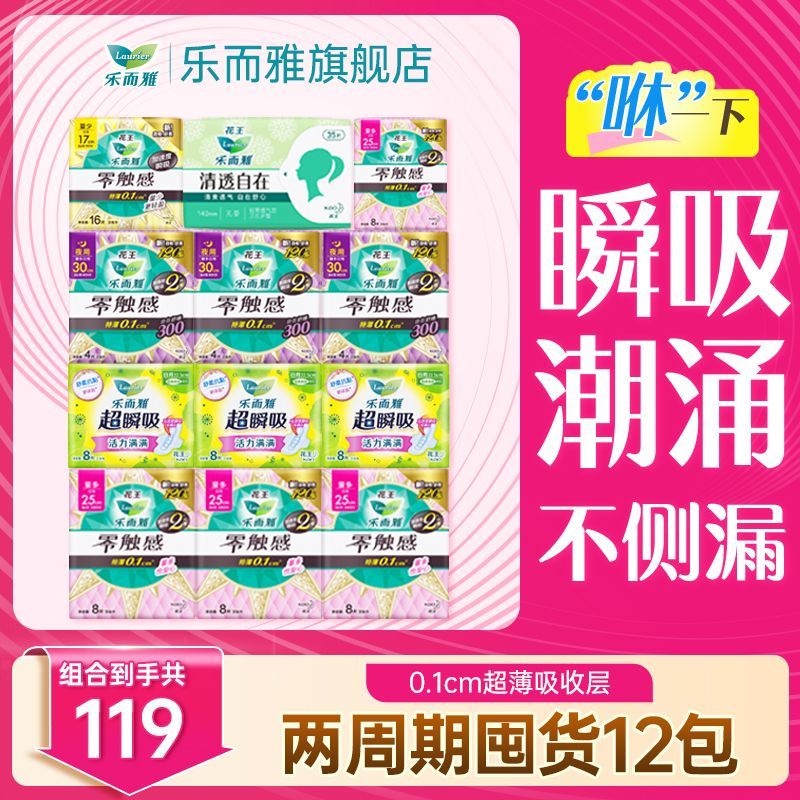花王乐而雅零触感卫生巾两周期日夜组合12包119片棉柔舒适防侧漏